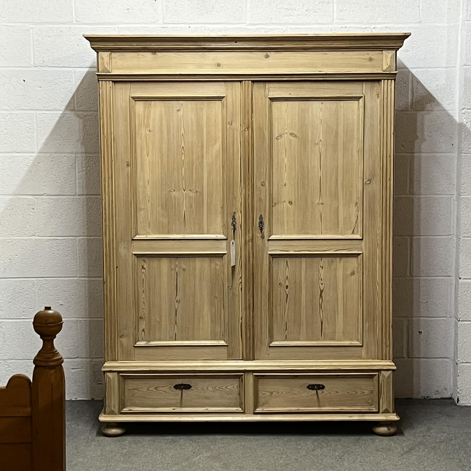 Large Antique Pine Double Wardrobe with Bottom Drawers