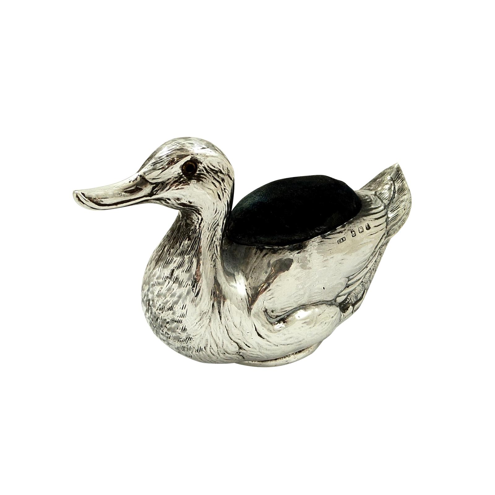 Large Antique Sterling Silver Duck Pin Cushion 1915