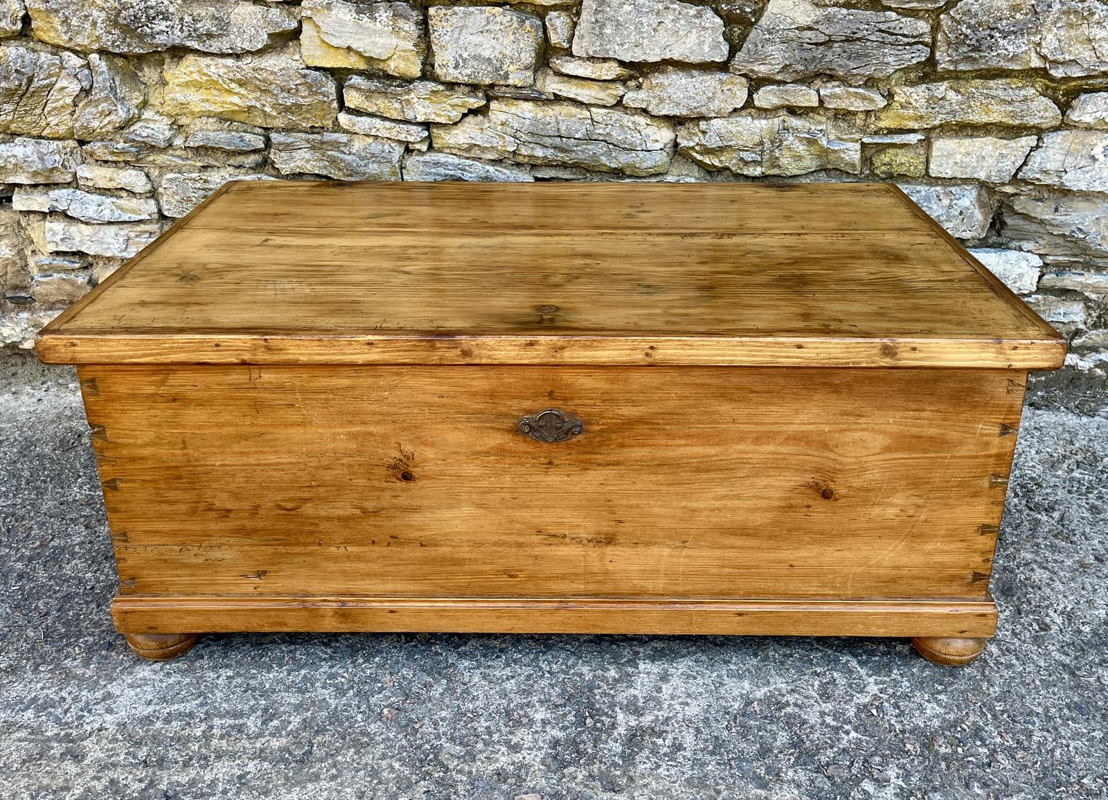 A good example of a large antique pine blanket box dating from the late 19th Century. It is likely continental in origin and has metal carrying handles on the sides and the lid opens on its original blacksmith-made strap hinges. It stands on turned bun feet and is a good quality piece with handmade dovetail joints.