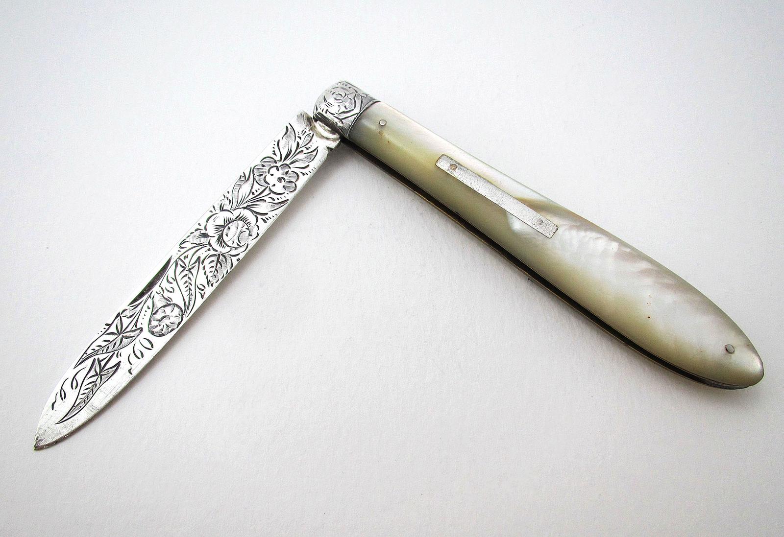 Large Antique Victorian Engraved Floral Sterling Silver & Mother-of-Pearl Fruit Knife, Sheffield 1857