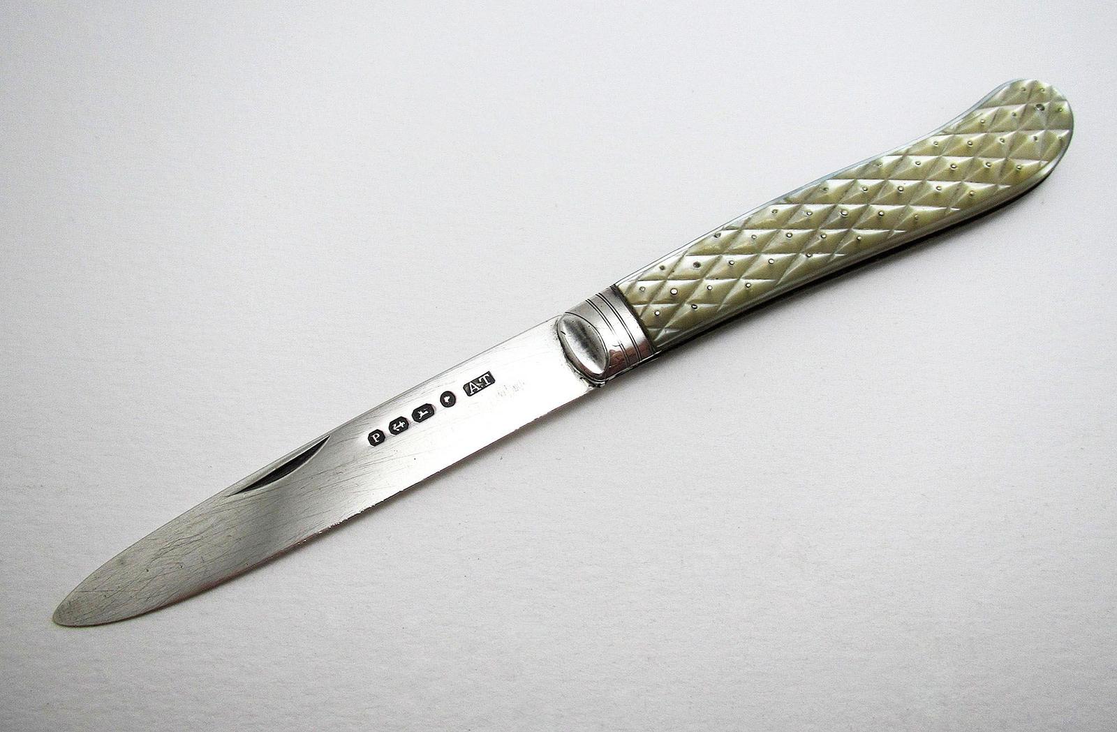 Large Antique Victorian Sterling Silver & Diamond Patterned Mother of Pearl Fruit Knife, Alfred Taylor
