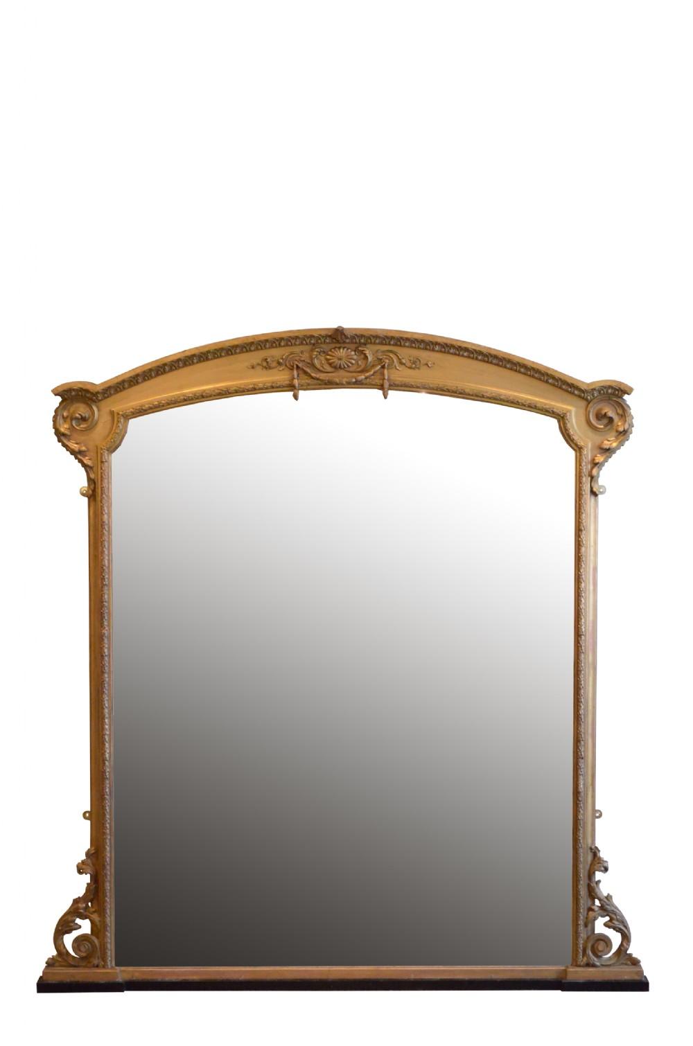 Large Victorian Overmantel giltwood mirror or arched form, having original mercury glass with some foxing and desirable sparkle in gilded frame with moulded can finely carved cornice above floral frieze, decorative laurel leaf carving throughout and leaf scrolls to the base. This antique mirror retains its original glass, original gilt with some toughing up over the years and original panelled backboards with four wall bracket, all ready to place at home. The mirror is woodworm free, all decoration is present, no loose elements. A true statement which would grace any interior. c1850