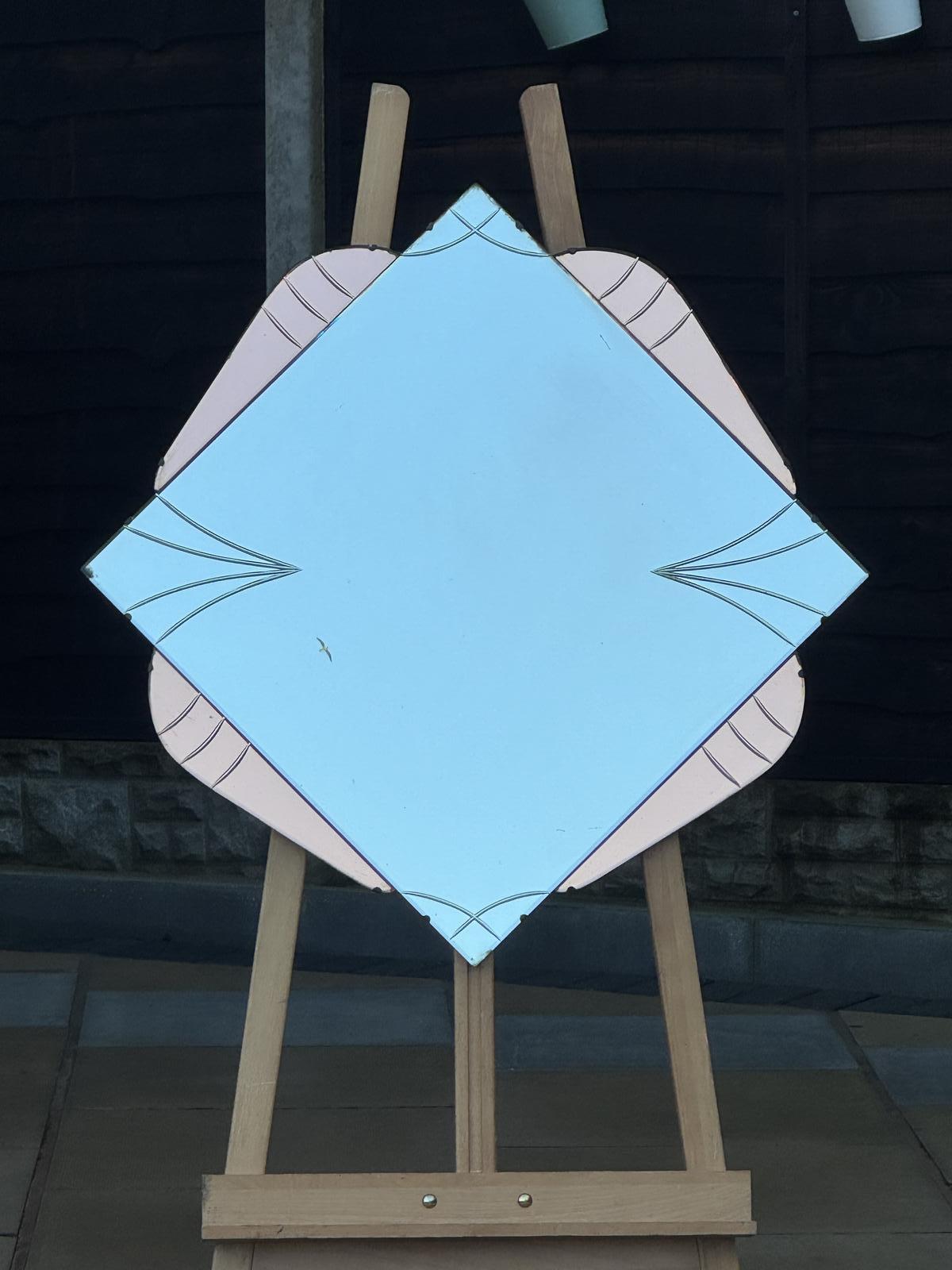 The Centre plate is the focal point of this mirror it can be diamond shaped or square dependent on how you hang the Mirror. It has. Some great linear features which added to the overall geometric deco design.
