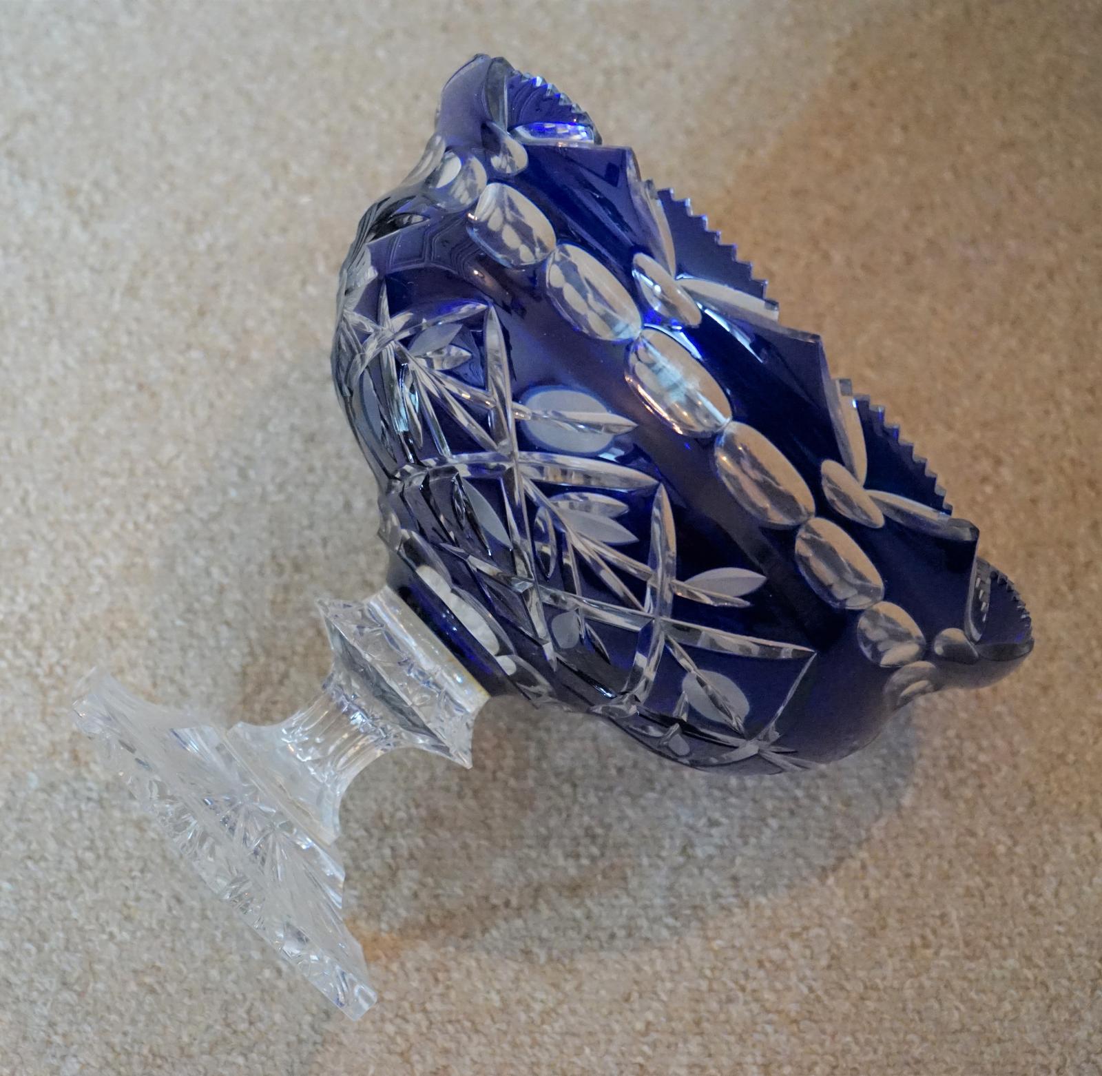 Large Bohemian Cobalt Blue Cut & Etched Clear Glass Punch Bowl