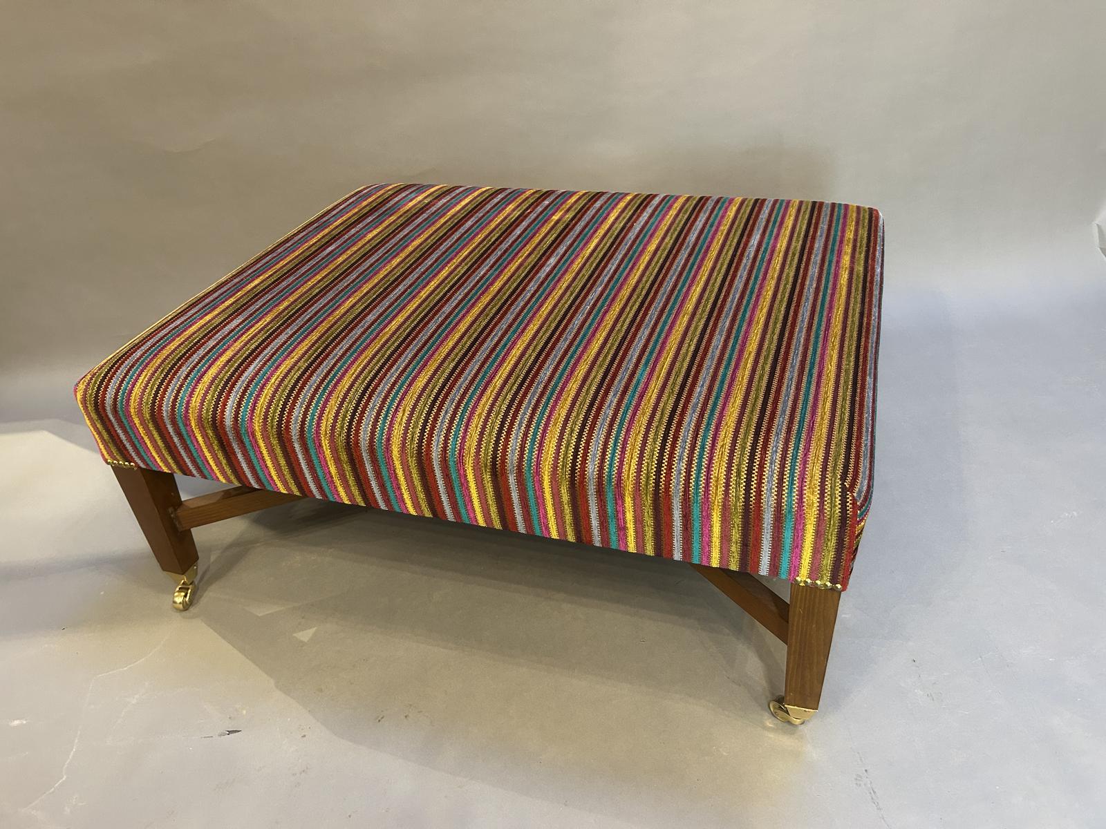 Contemporary bespoke upholstered in stripped fabric raised on tapering square section supports united by stretchers and terminating in brass cap castors