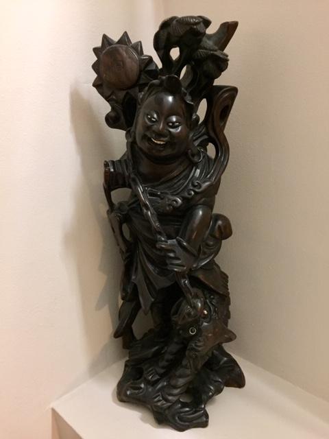Large Chinese Carved Hardwood Figure of Immortal with Foo Dog
