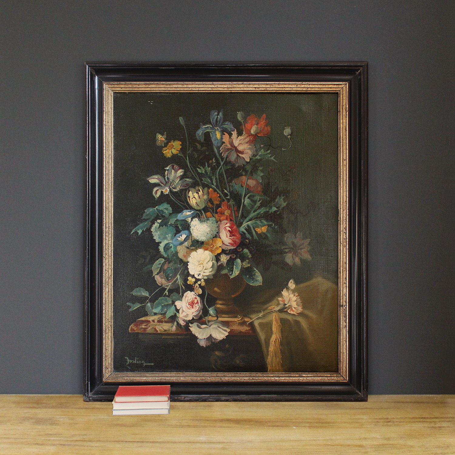 Large Continental School Still Life with Flowers, Antique Oil Painting