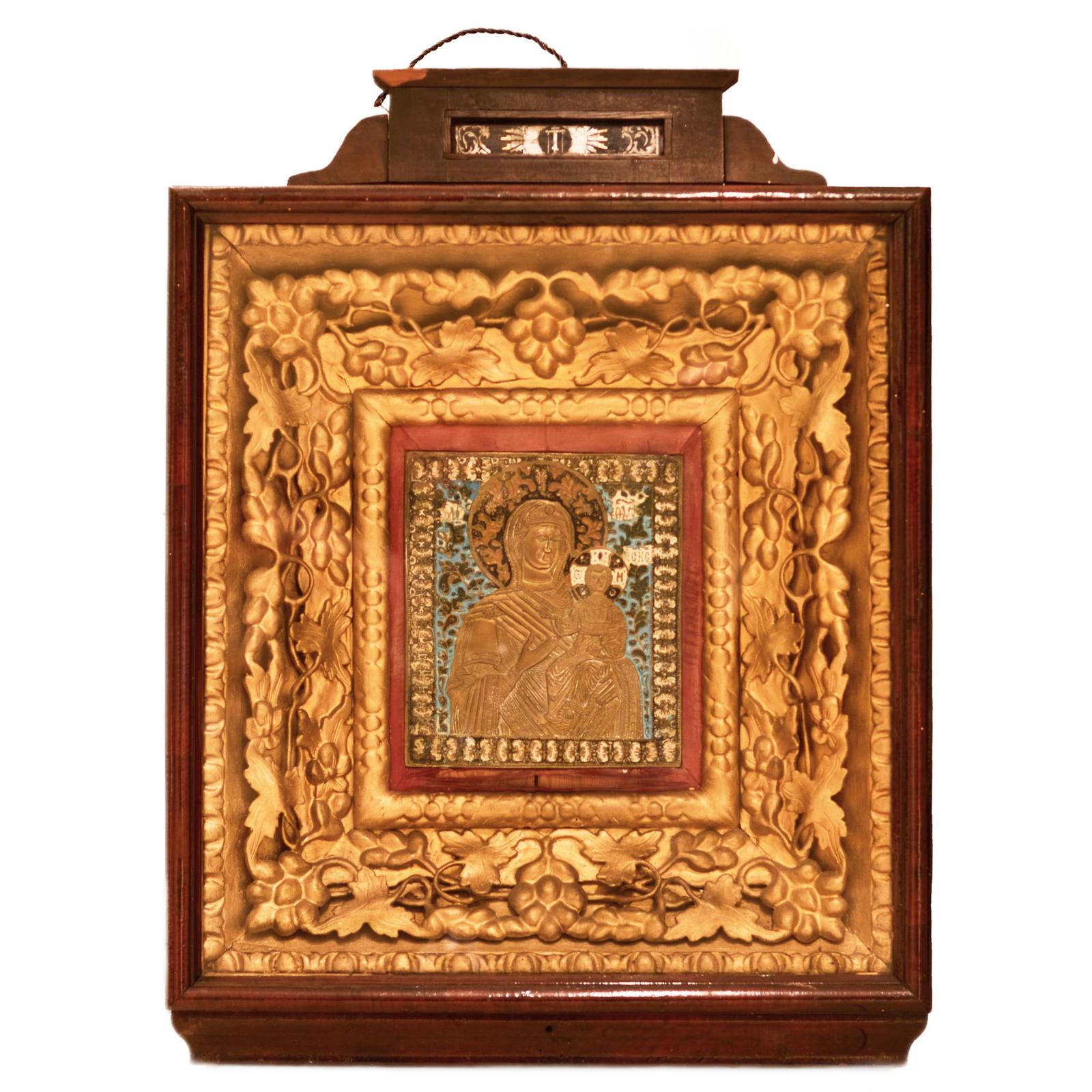 Large, Copper-Cast Icon of the Smolensk Mother of God, with Five Enamels, in an Icon Case. Russia. 19th Century.