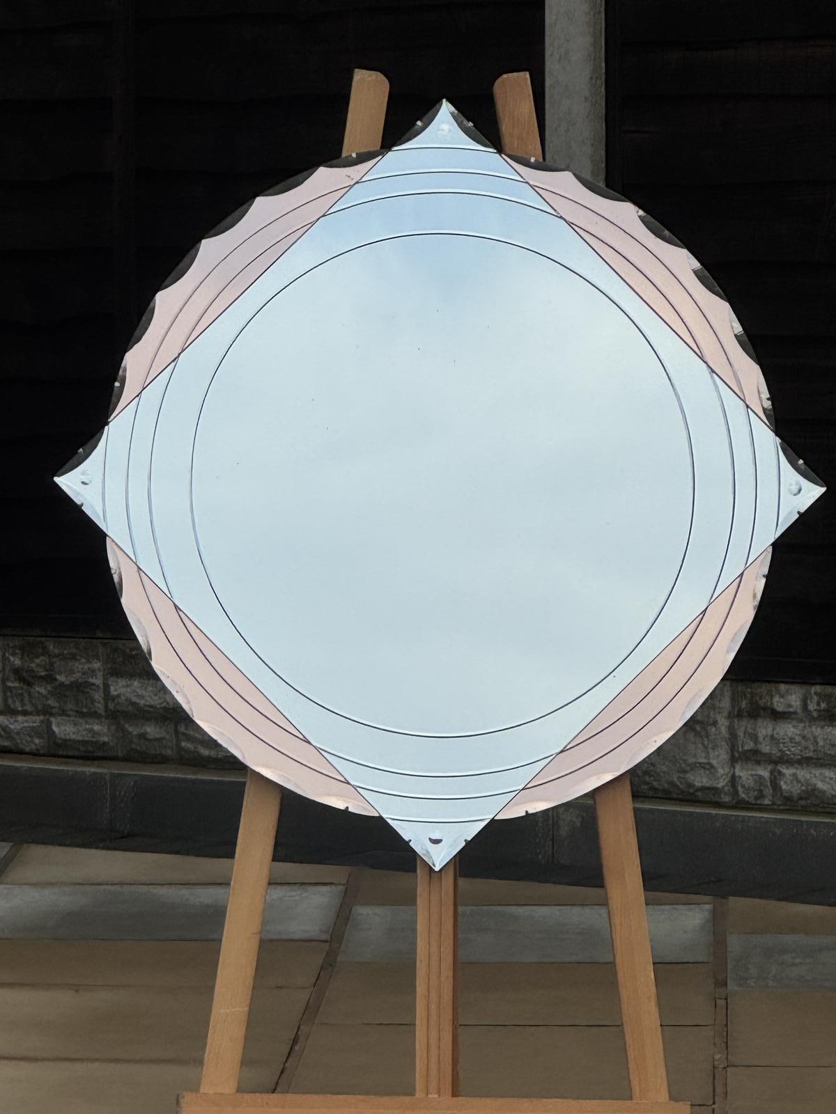 The mirror is made up of five independent pieces, a large centre plate that is square or diamond shaped and has deep scalloped edges at the corners and a top cut circular design which links into the outer edges.