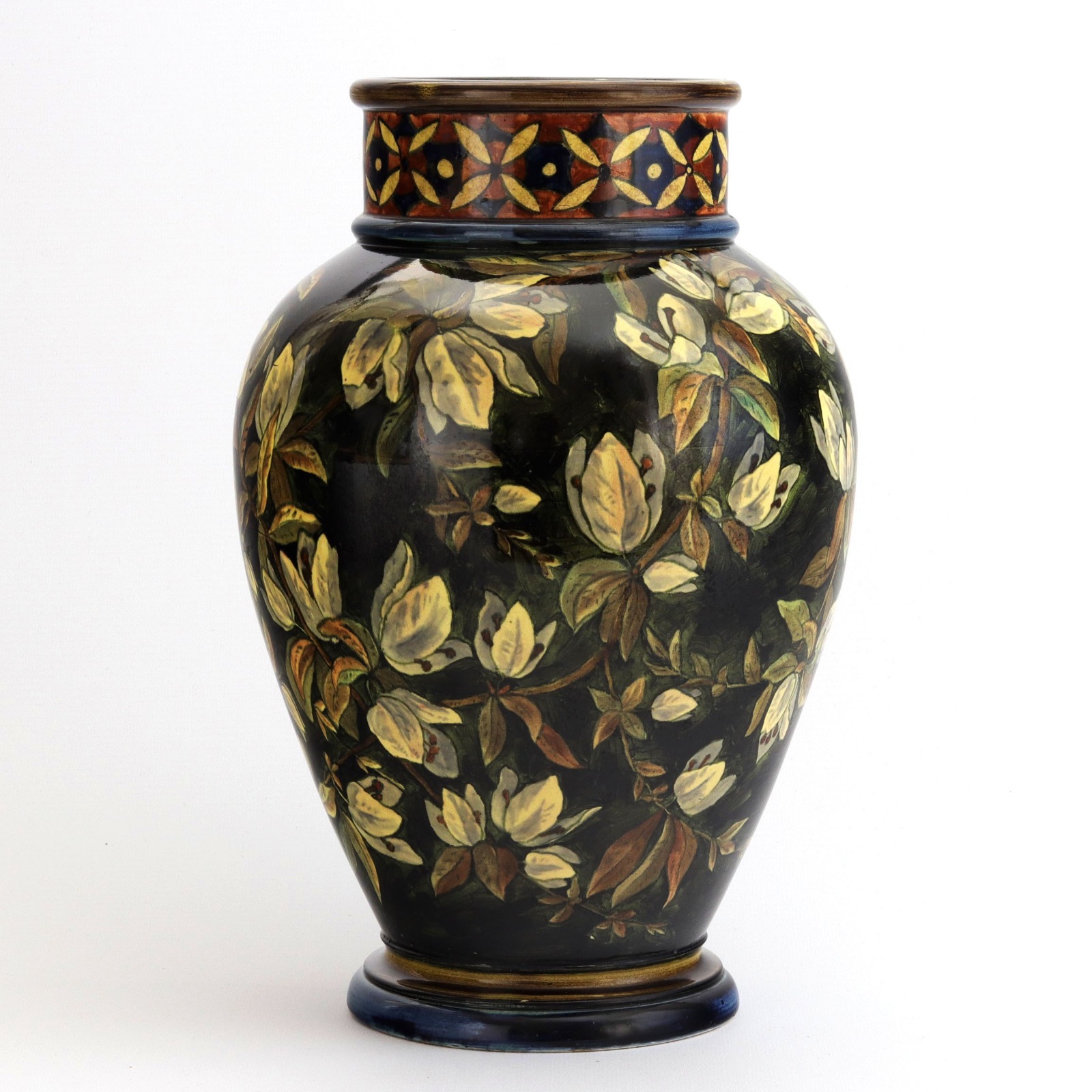 Large Doulton Faience Stoneware Vase with White Paperflower Dated 1877