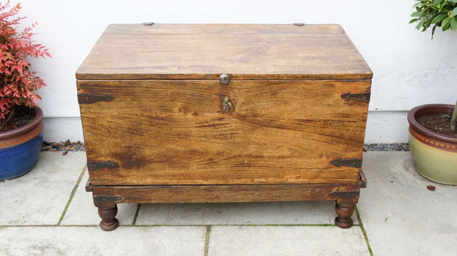 Large Early 20th Century Colonial Padauk Storage Trunk / Chest On Stand