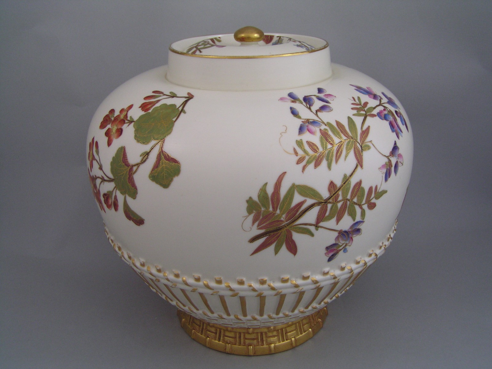 Large Early Royal Worcester Blush Ivory Basket Weave Lidded Vase 1889