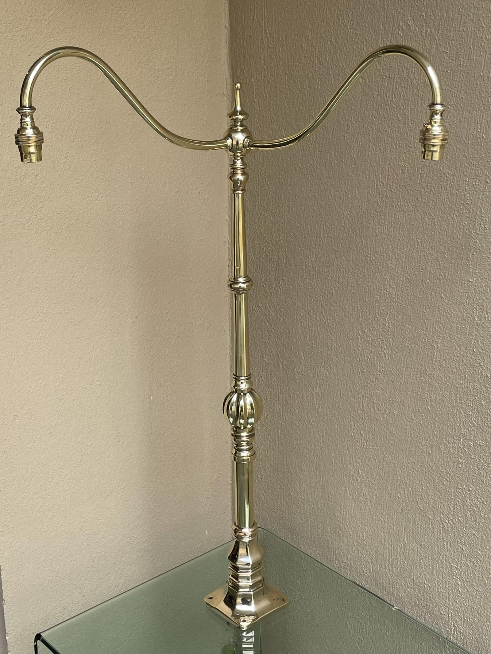 An impressive Edwardian period solid brass newel post lamp of large proportions with twin arms. Professionally repolished and fully rewired and PAT safety tested. We can supply with a variety of shades for an additional sum.