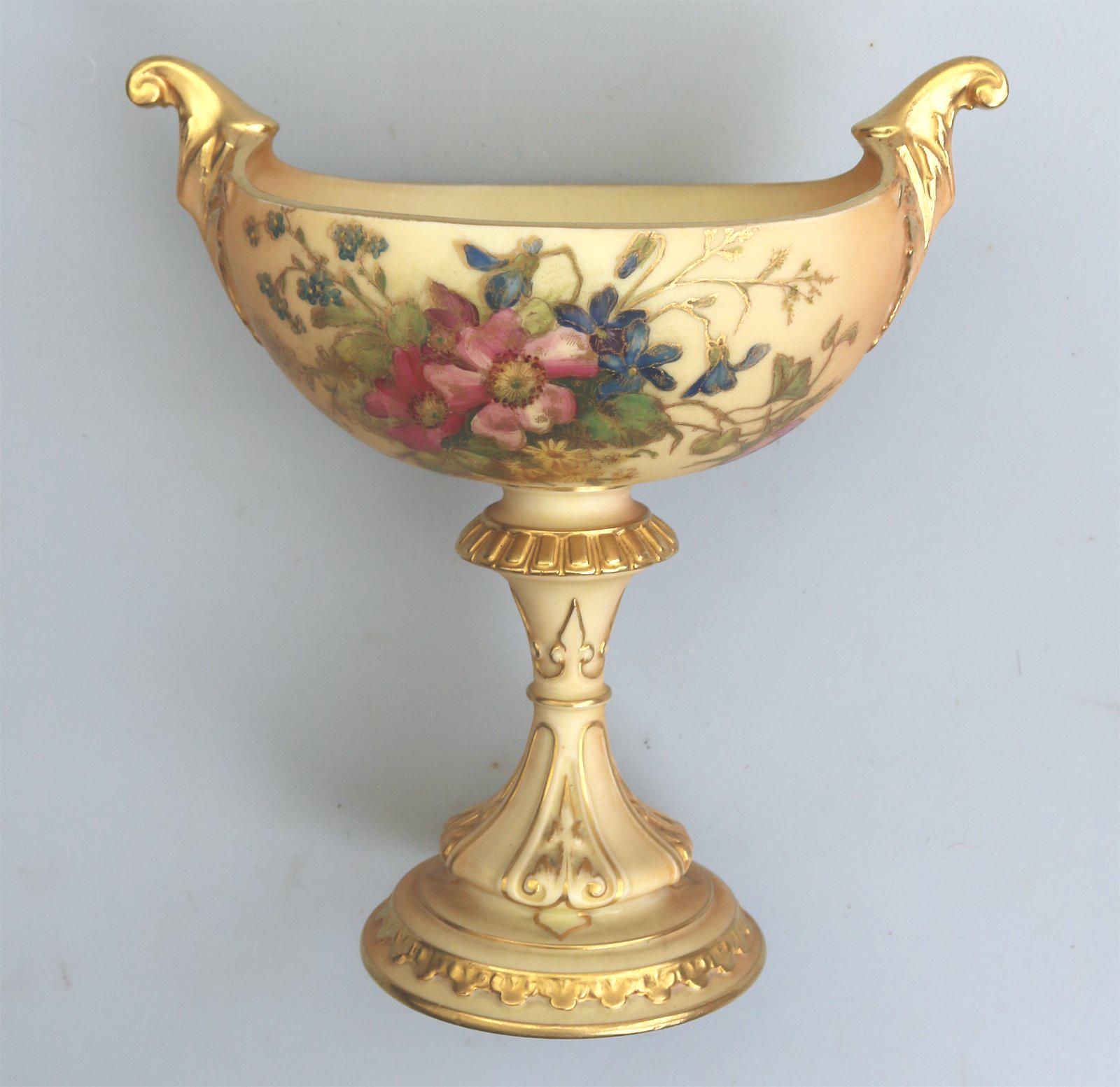 Large & Fine Royal Worcester Blush Ivory Style & Floral Navette Pedestal Bowl c.1912