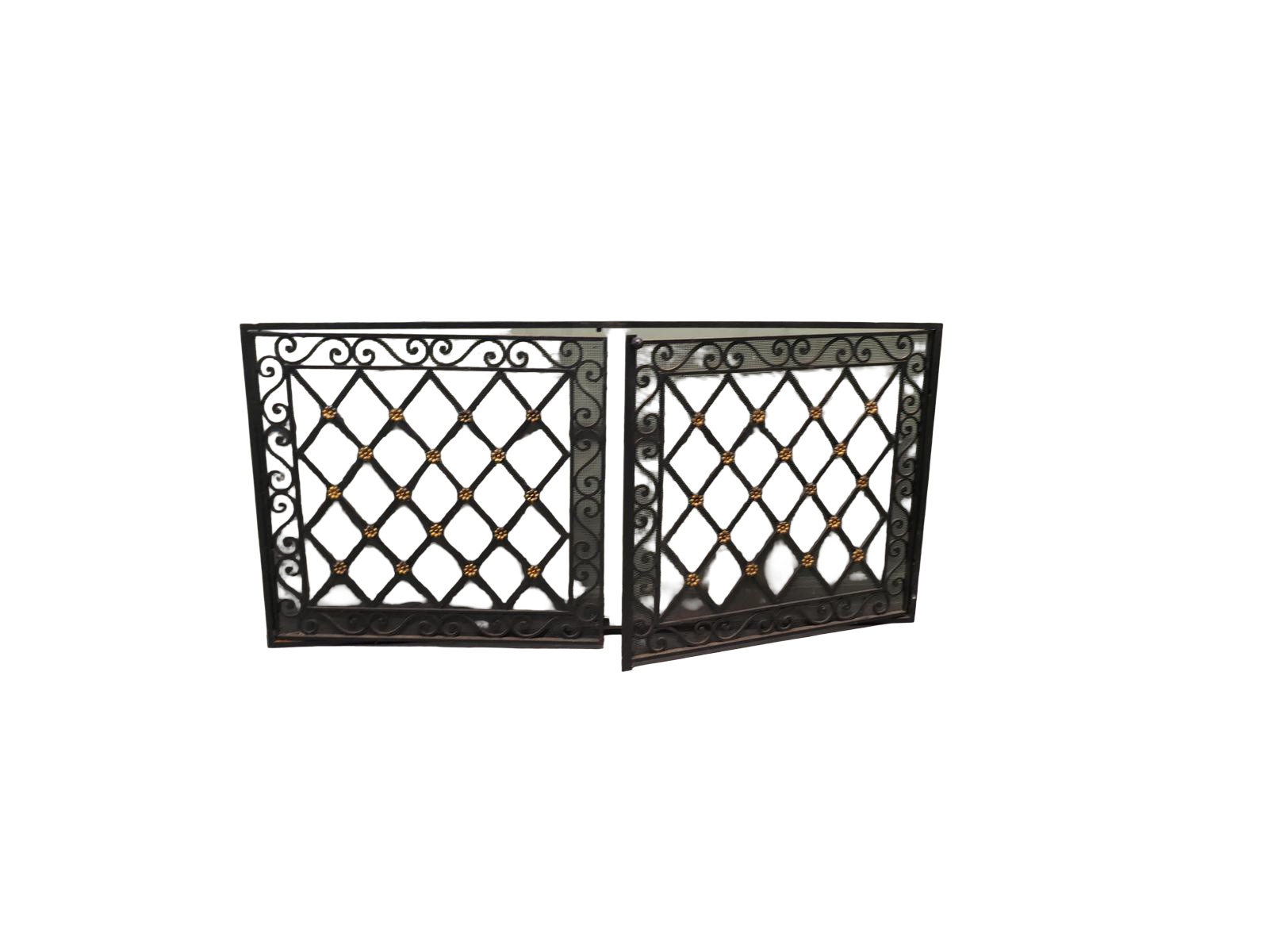 The guard has a decorative wrought iron pattern over heavy inset mesh