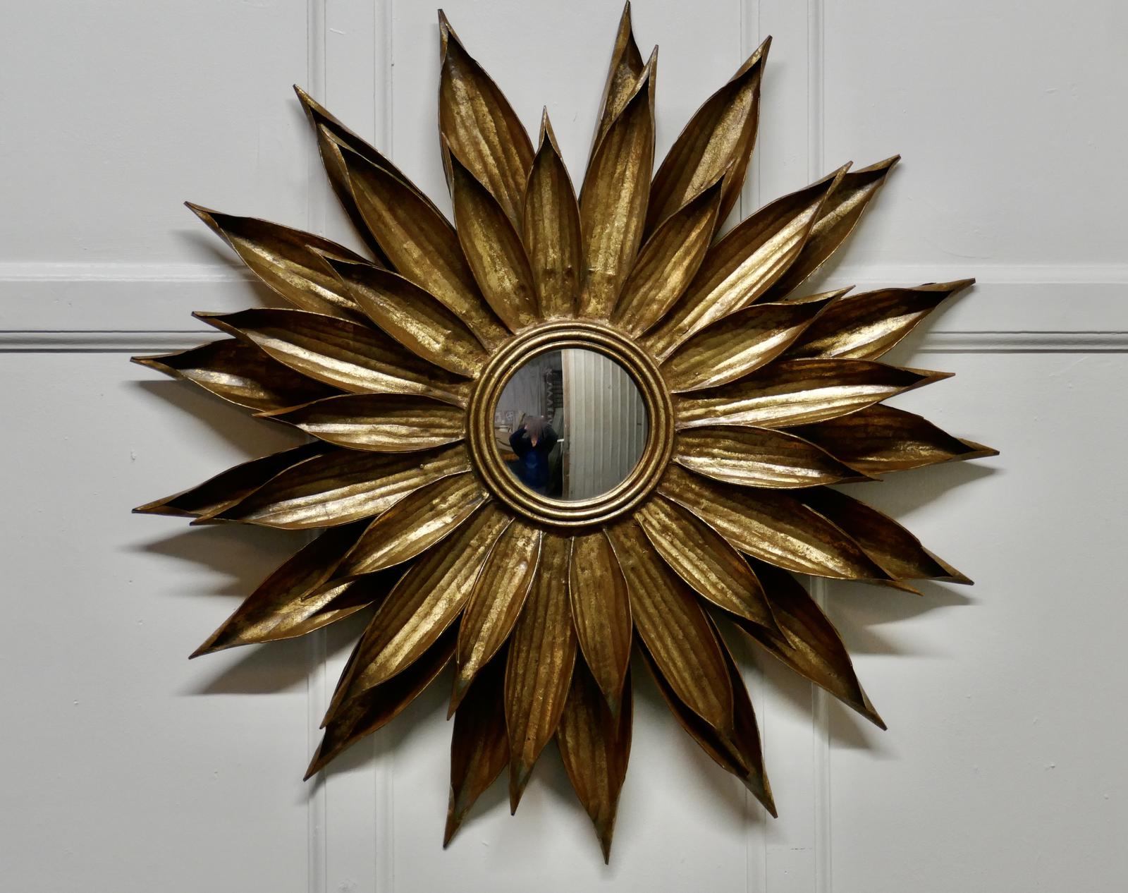 Large French Art Deco Sunburst-Starburst Toleware Convex Gilt Mirror