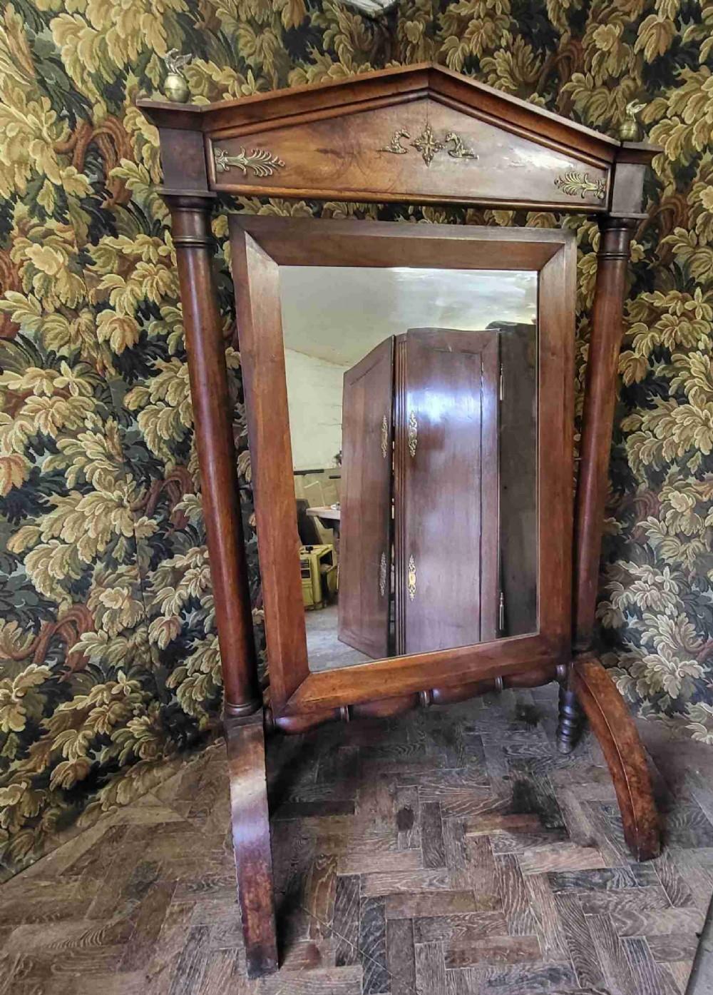 Hutton-Clarke Antiques is pleased to offer a country house oversized cheval mirror from the Empire period in France, likely originating from a large chateau. This exceptional piece features a pedimented top with mounts, below are two columns with flamed veneering. The large original mirror plate swivels to the desired position for optimal viewing. The base consists of down-swept legs united by a turned stretcher, with additional central turned legs providing extra strength and stability. This mirror is a particularly fine example, notable for its large size, as most mirrors of this kind tend to be smaller and less practical for viewing oneself while dressed.