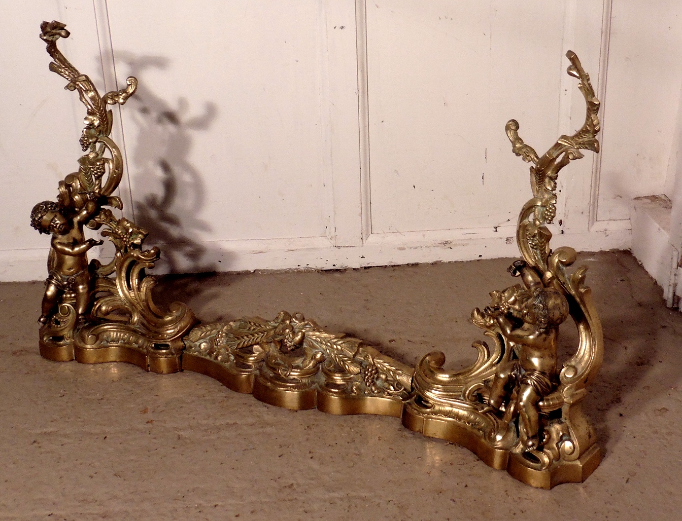 Large French Classical Rococo Brass Fender Decorated with Putti Chenets