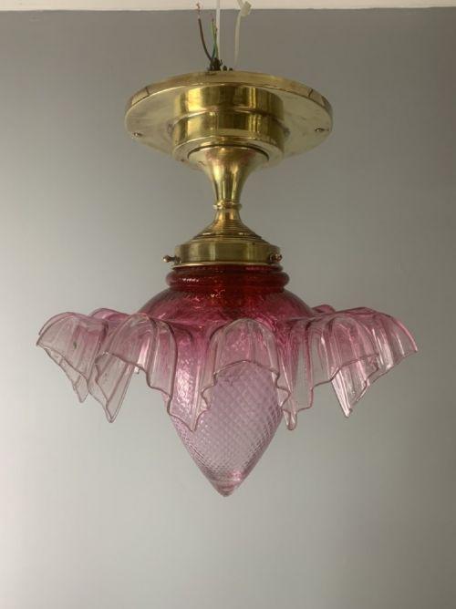 Large French Cranberry Shade Brass Ceiling Light, Rewired
