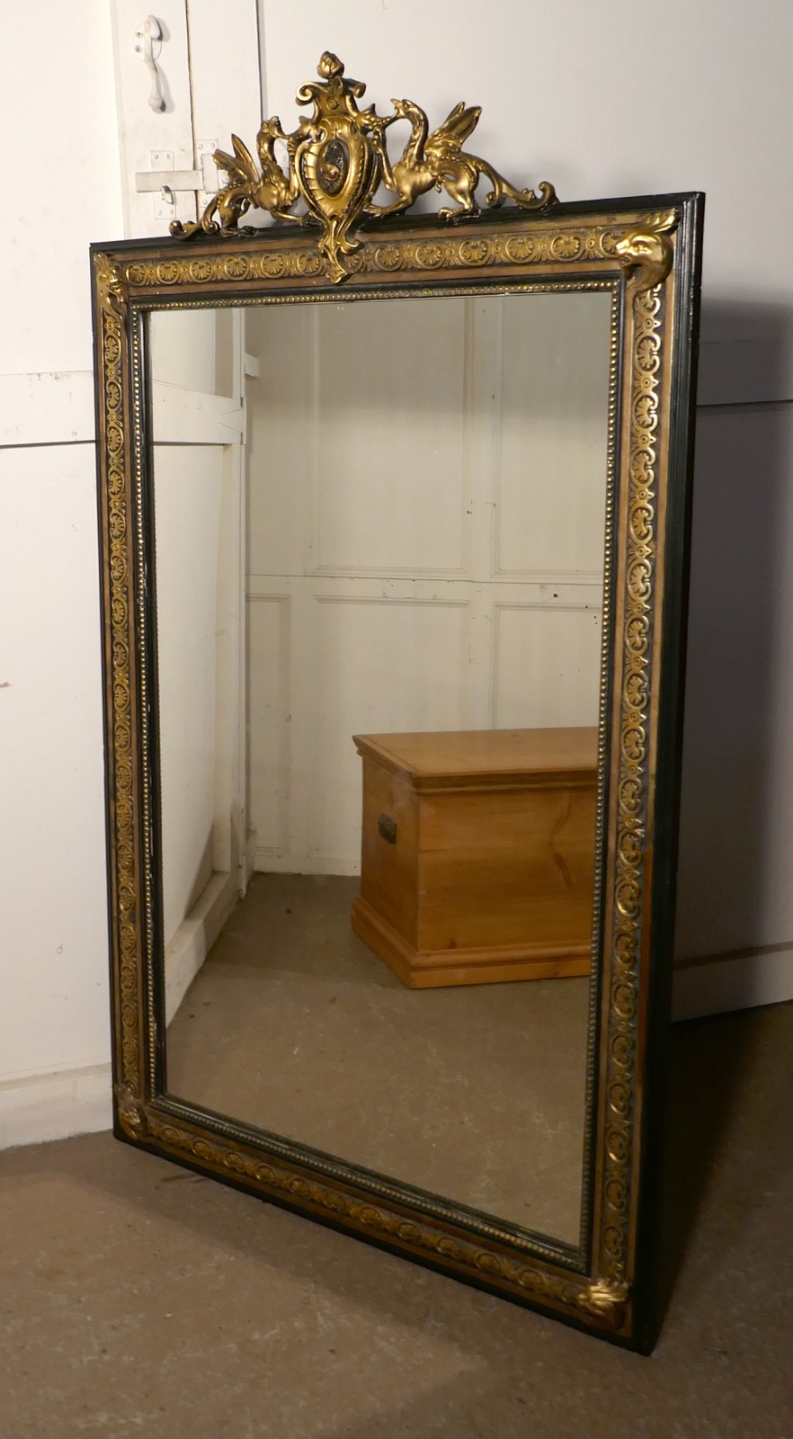Large French Ebonised, Brass & Gilt Wall Mirror, Dragons & Crest