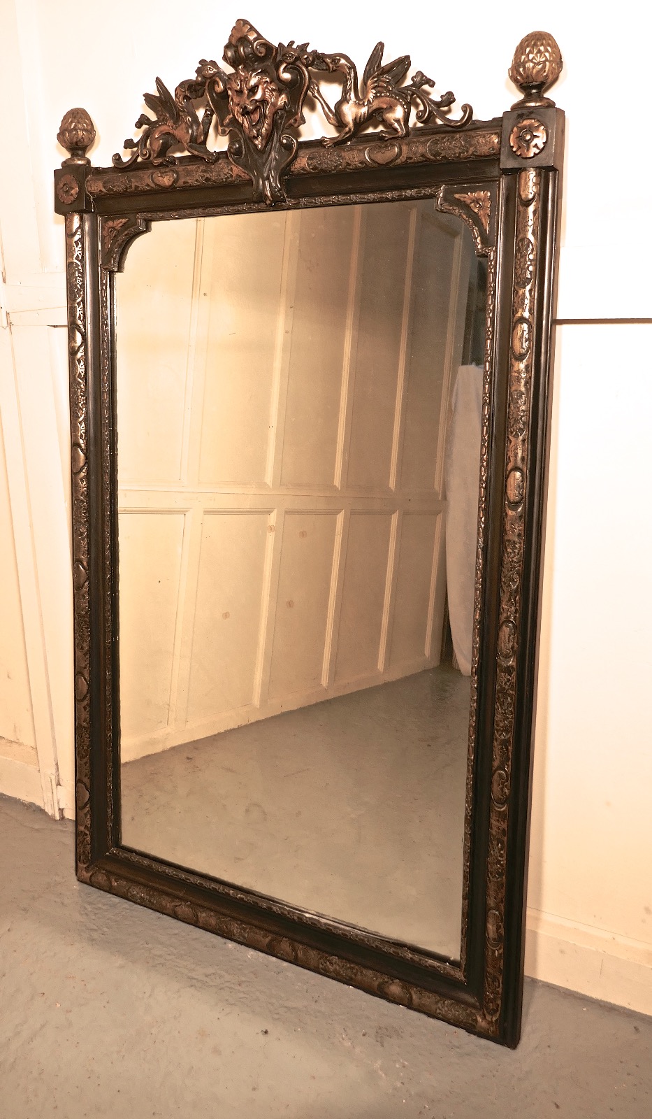 Large French Ebonised & Gilt Mirror, Lyons Mask & Dragon Crest