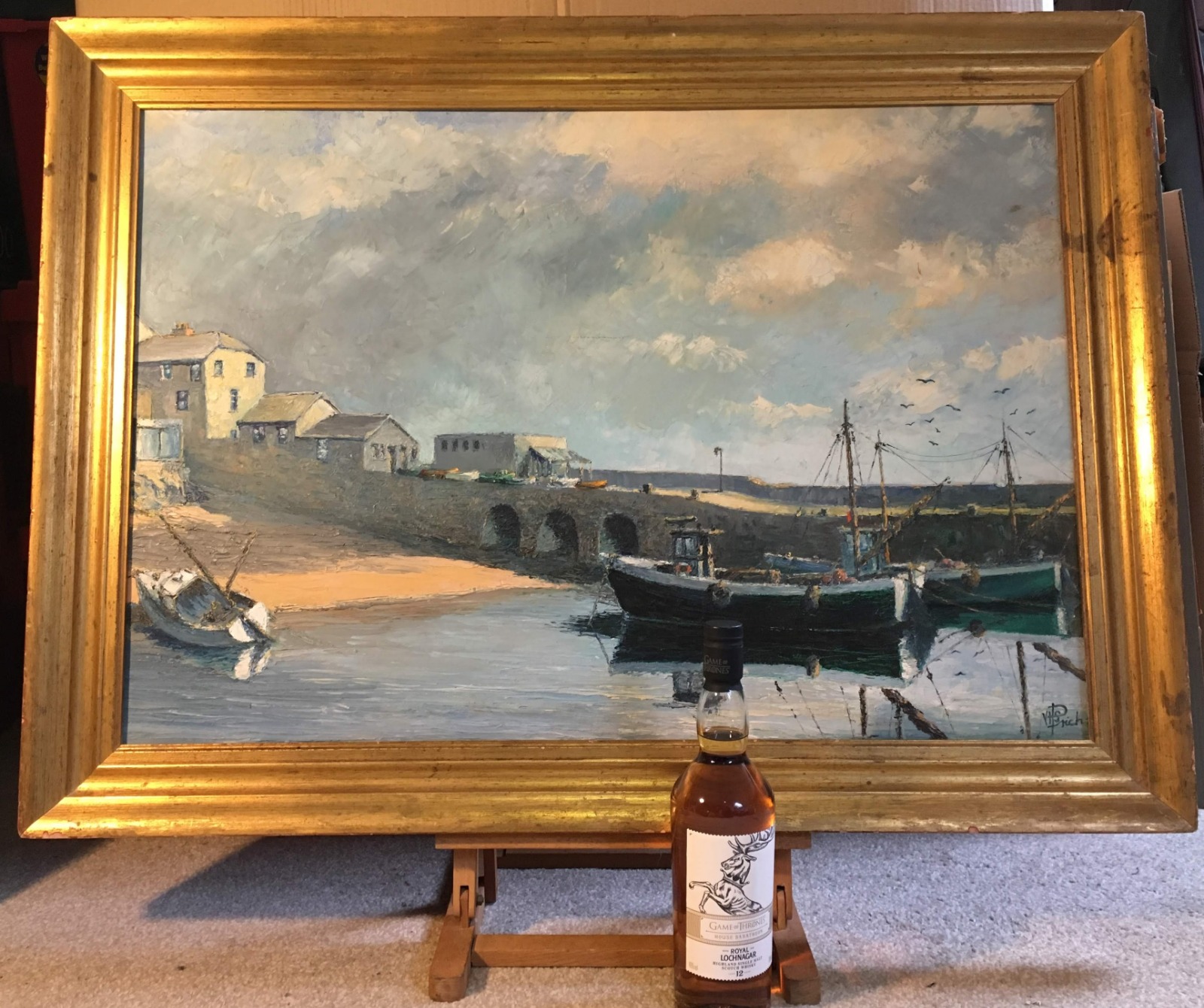 Large French Impressionistic Fishing Harbour Seascape Oil On Board Painting C.1950