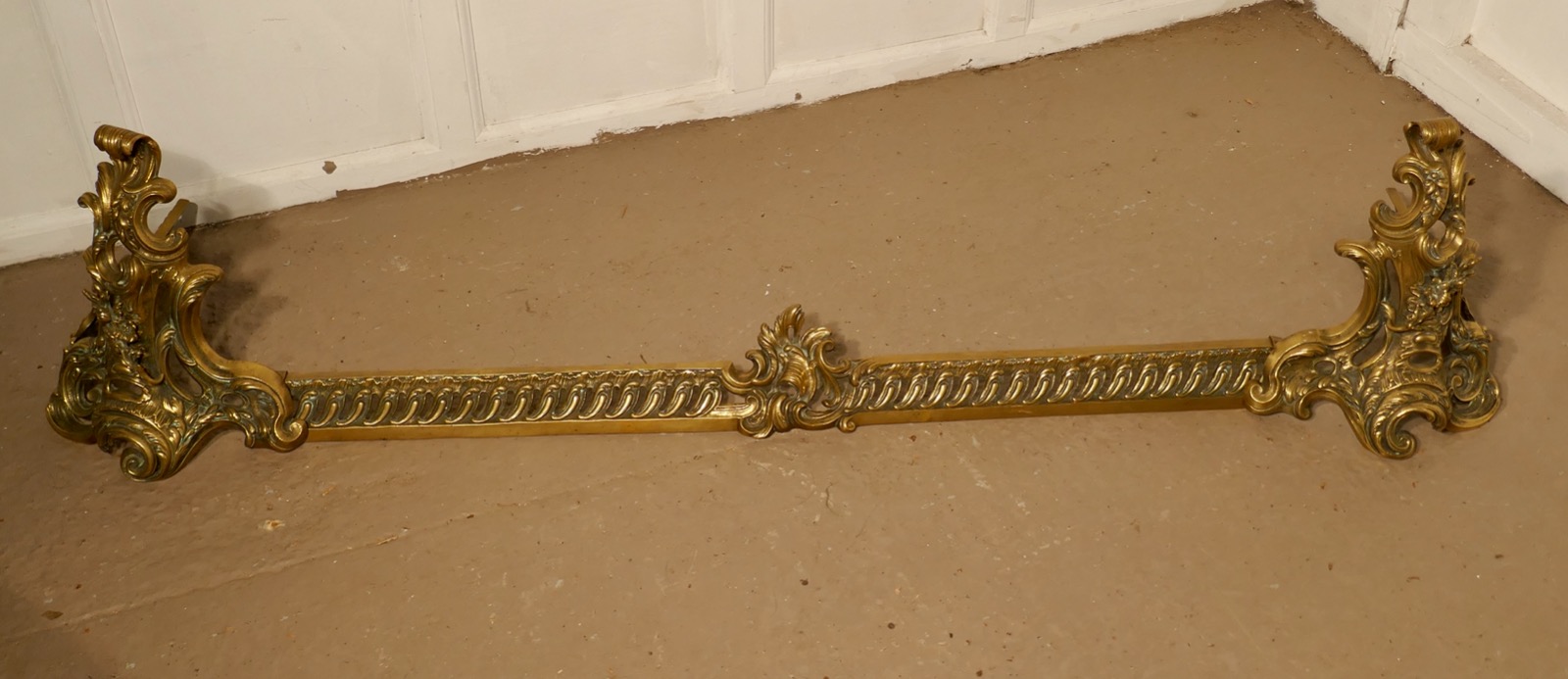 Large French Rococo Brass Extending Fender with Decorative Chenets