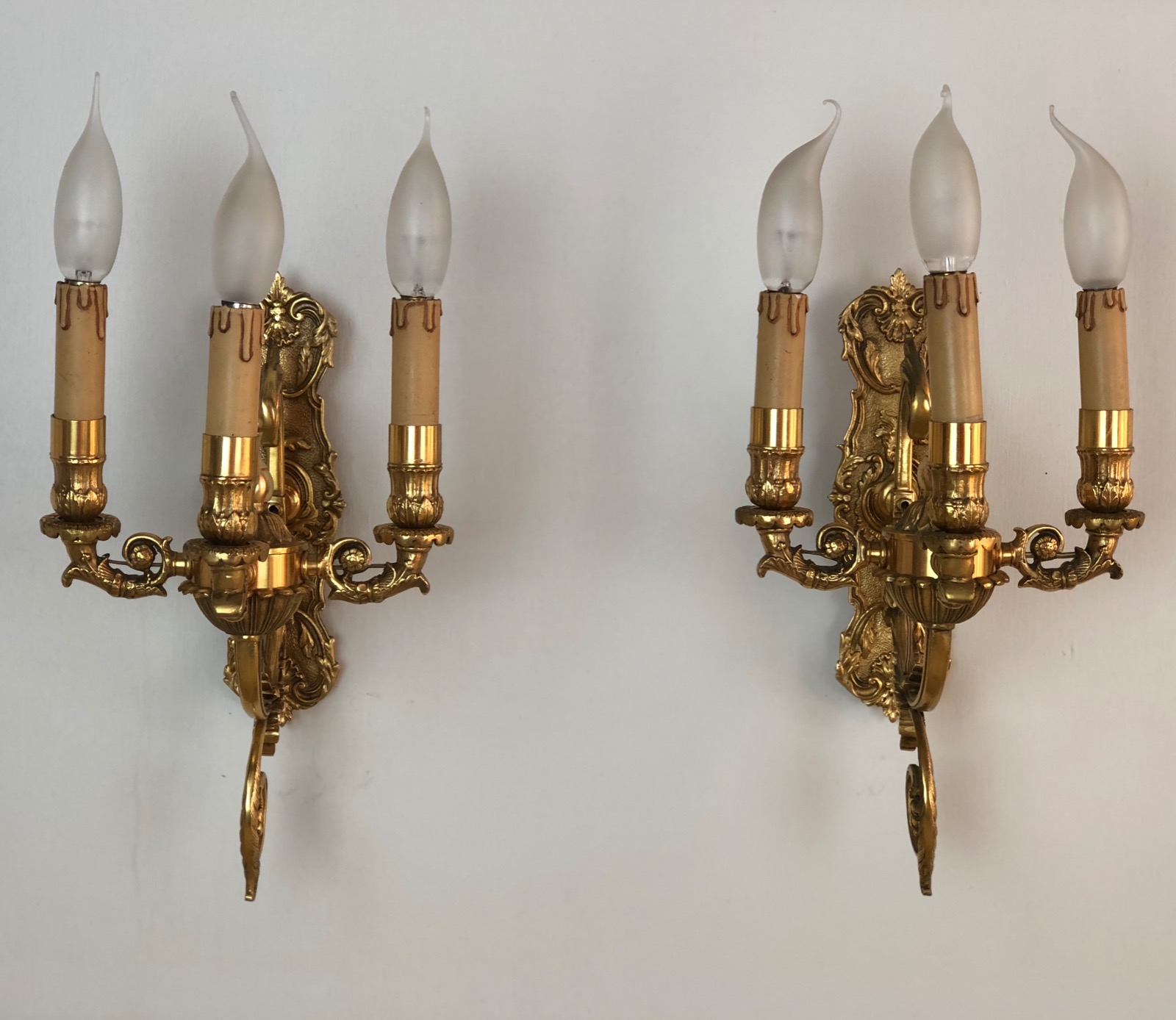 Large French Rococo Style Gilt Bronze Triple Arm Wall Lights Sconces
