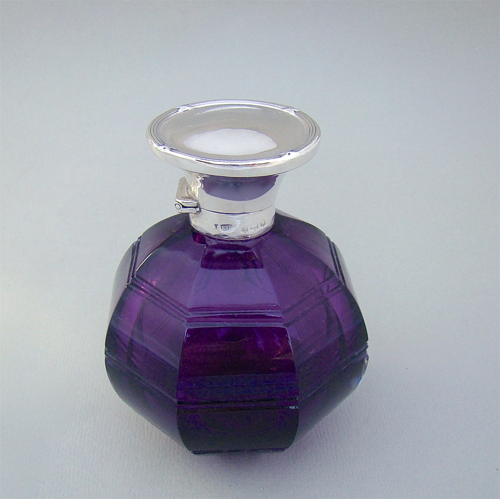 Large George V Silver & Amethyst Glass Scent Bottle by Edward Souter Barnsley, Birmingham 1921