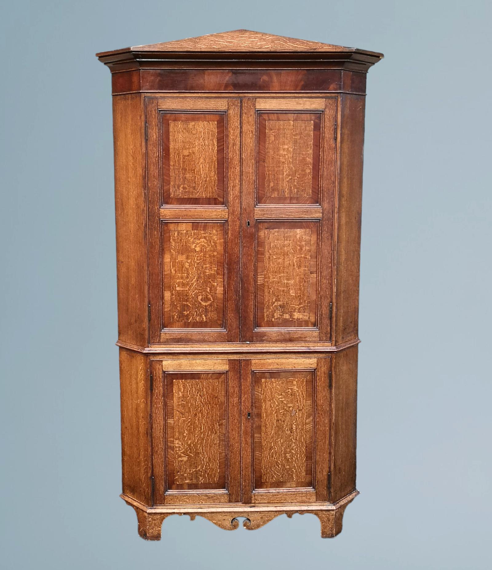 Large Georgian Oak & Mahogany Crossbanded Double Corner Cupboard