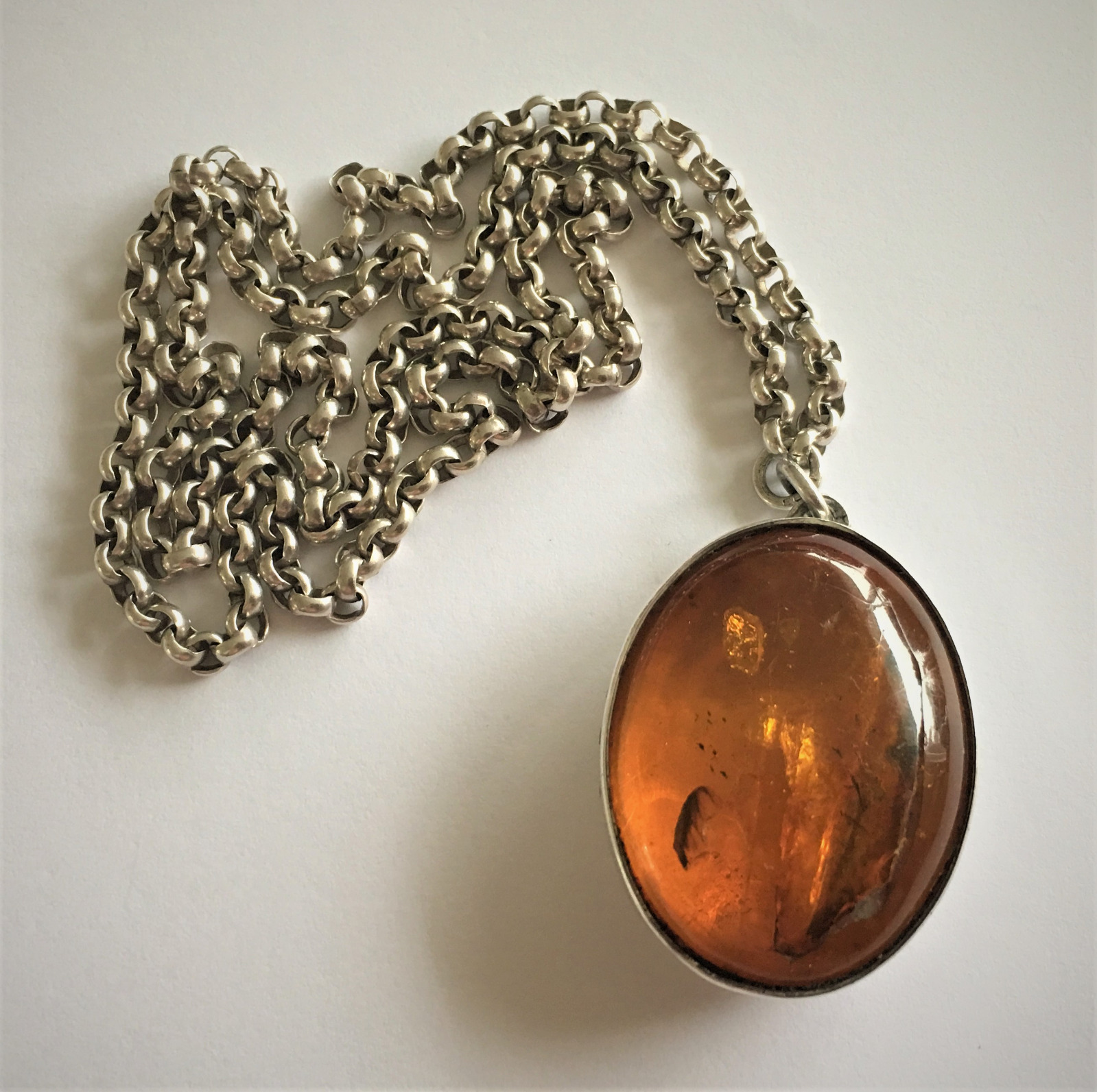 Large Hallmarked Silver Mounted Amber Pendant with Silver Chain, London 1987, Jg