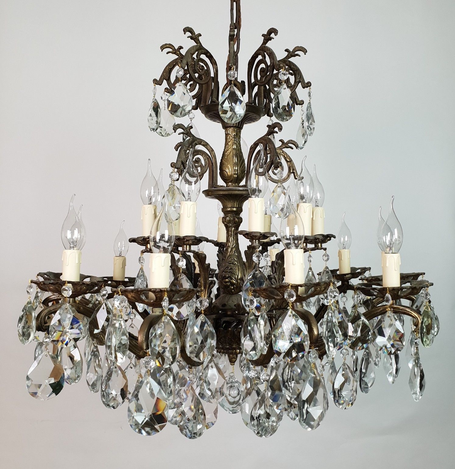 Large Heavy 20 Arm Aged Gilt Brass Crystal Antique Chandelier; Rewired c.1910