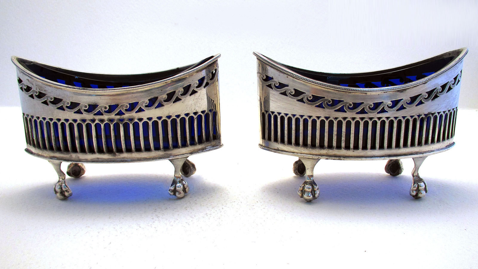 Large Heavy Pair '138G' Victorian Navette Shape Pierced Antique Solid Sterling Silver Hallmarked Master Salts, Original Blue Glass Liners (1 of 1)