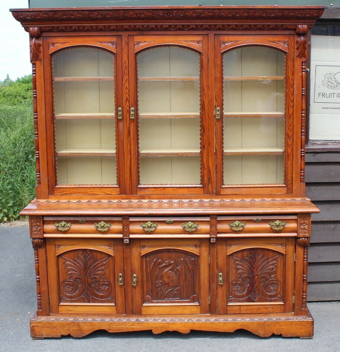 Large Highly Carved Pitch Pine 3 Door Bookcase c.1920