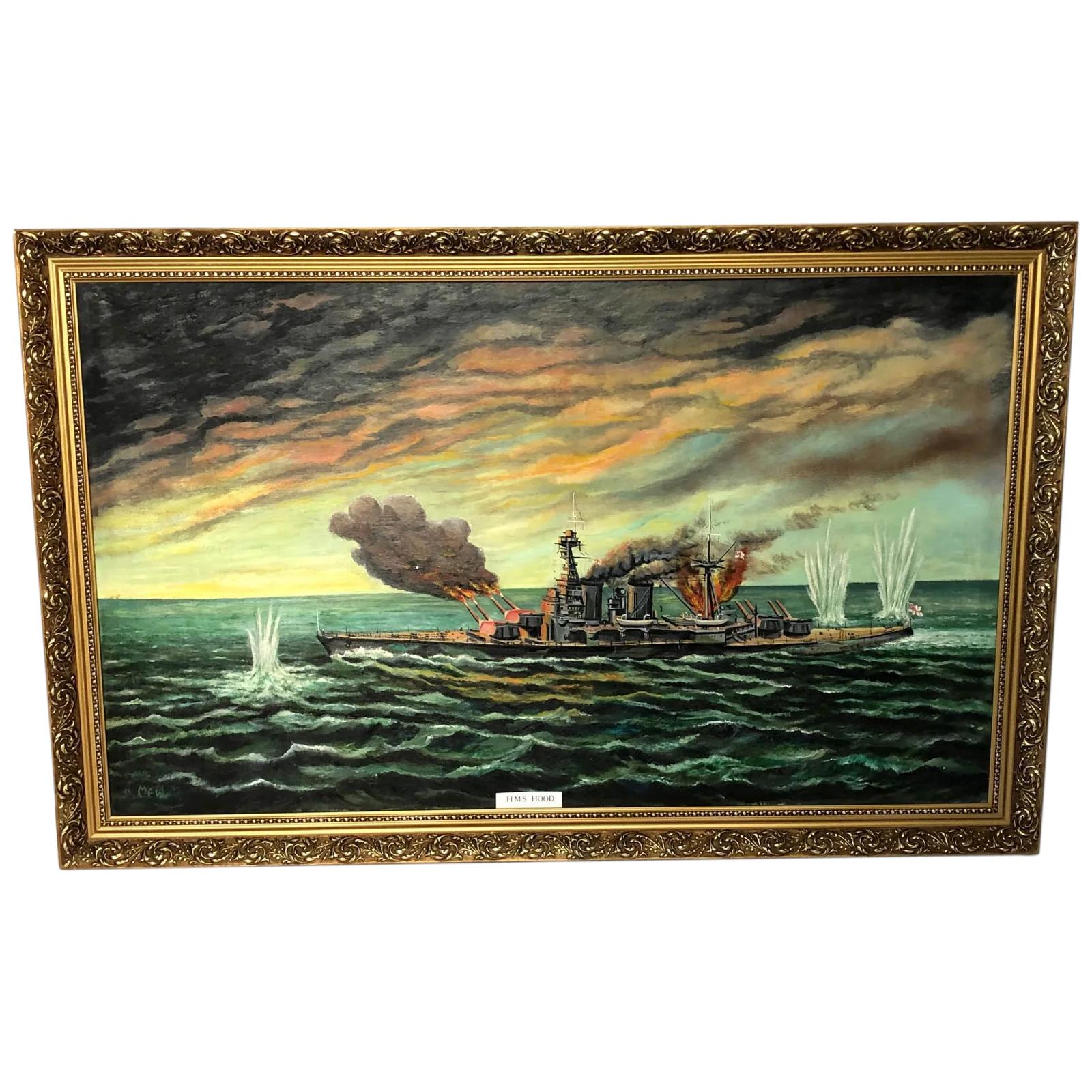 Large Impressive Seascape Oil Painting WW2 Battle "HMS Battleship Hood The Last Moments"