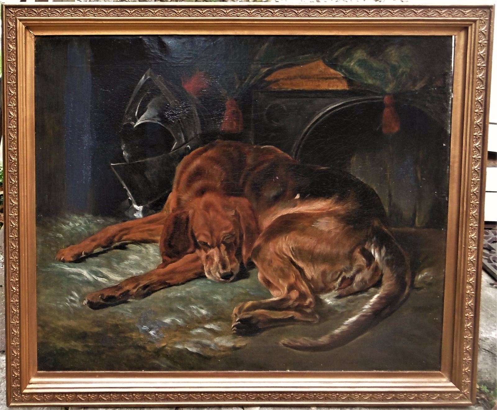 Large & Impressive Sleeping Hound Oil on Canvas Gilt Framed Painting