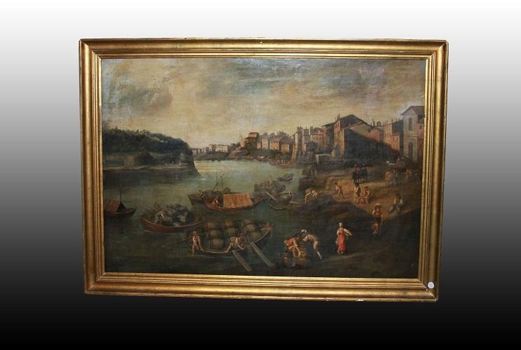 Large Italian Oil on Canvas from 1700 Depicting Workers at the Port