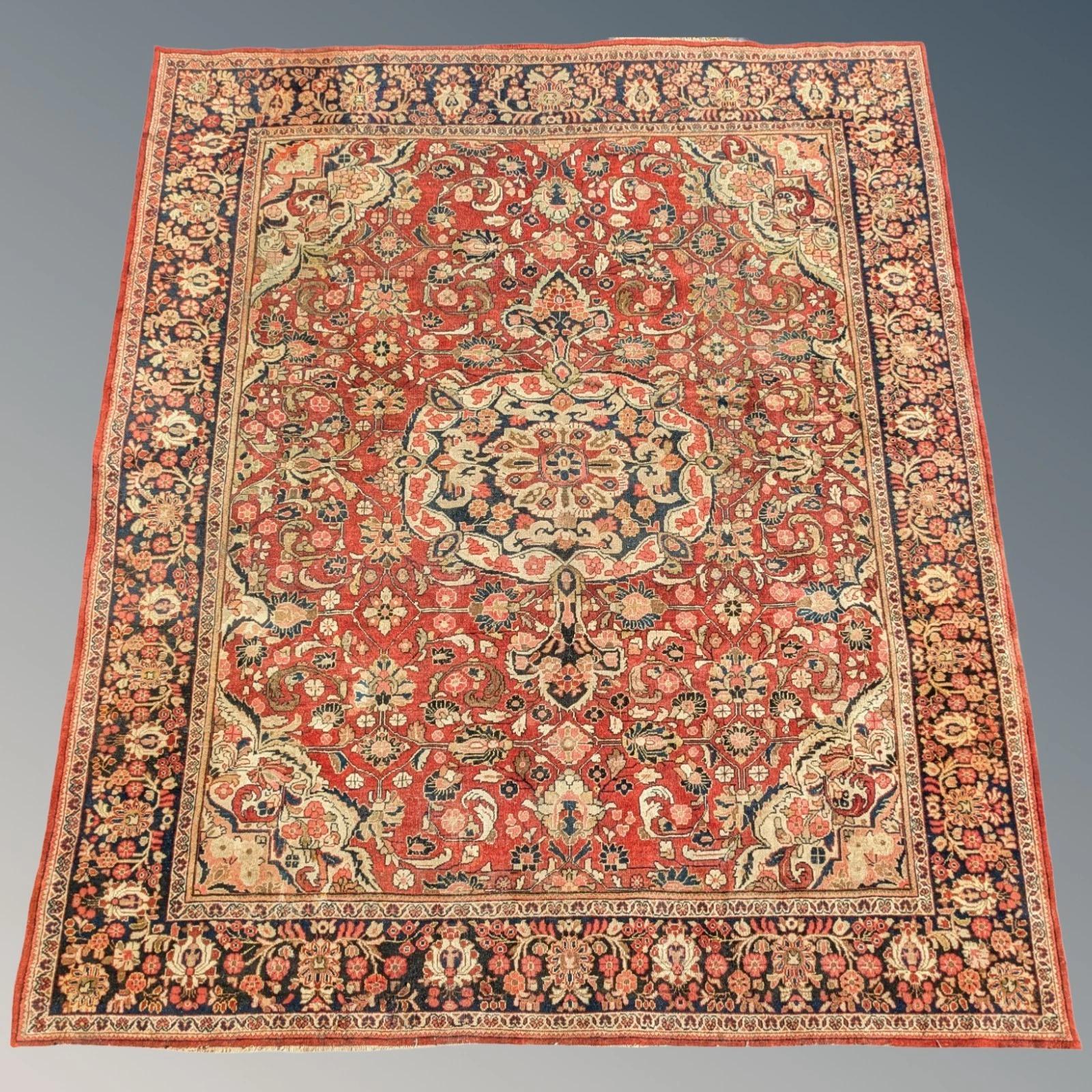 The room size carpet has a raspberry field centred by a large floral medallion framed by spandrels and indigo borders of palmettes and flowers, flanked by guard stripes. The Mahal has a great colour combination and good detail to the design which incorporates multiple flower motifs with acanthus leaf scrolls a large central medallion.