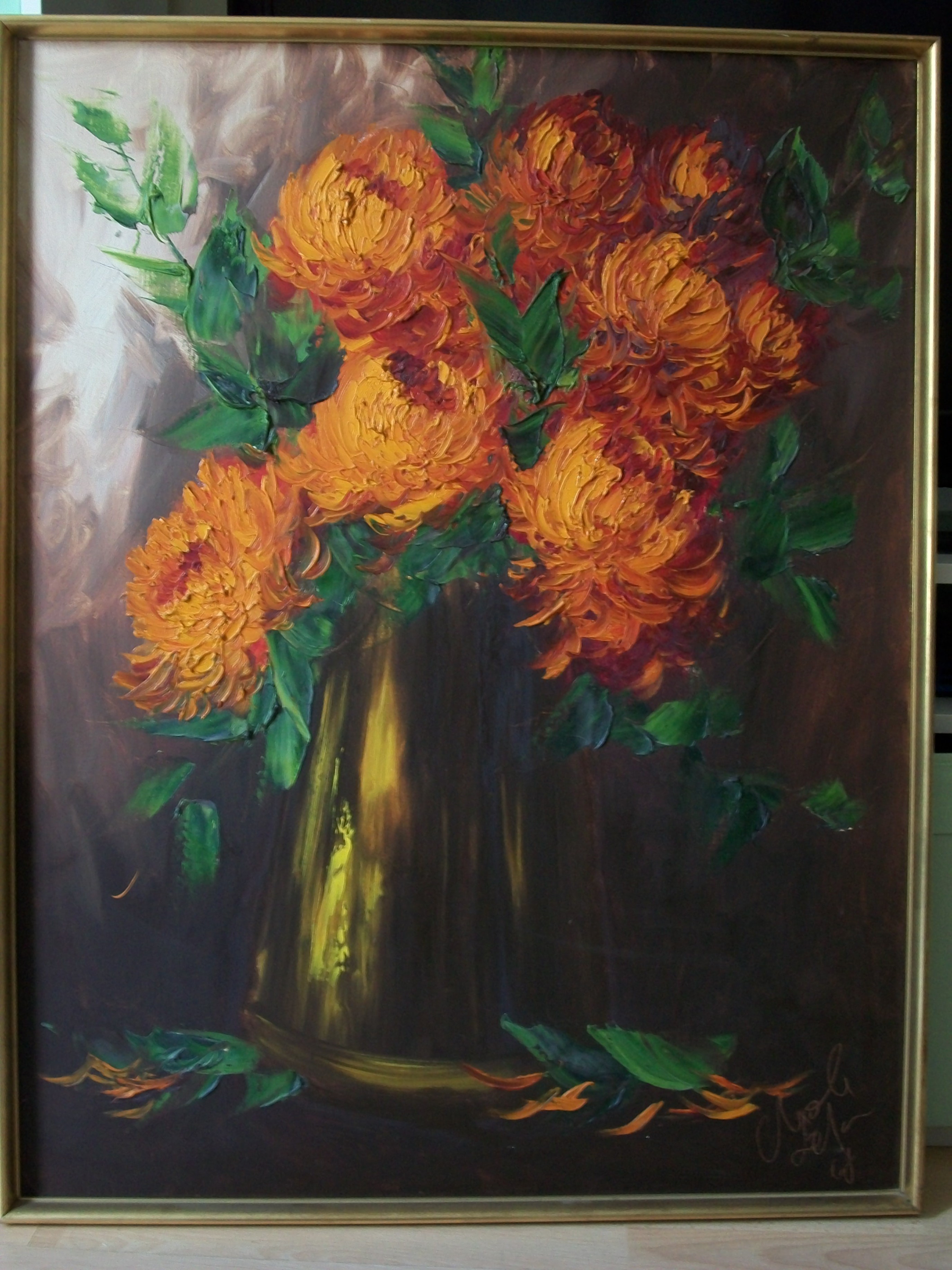 Large Oil painting on canvas dated 1967 and signed, still life 'Chrysanthemums'