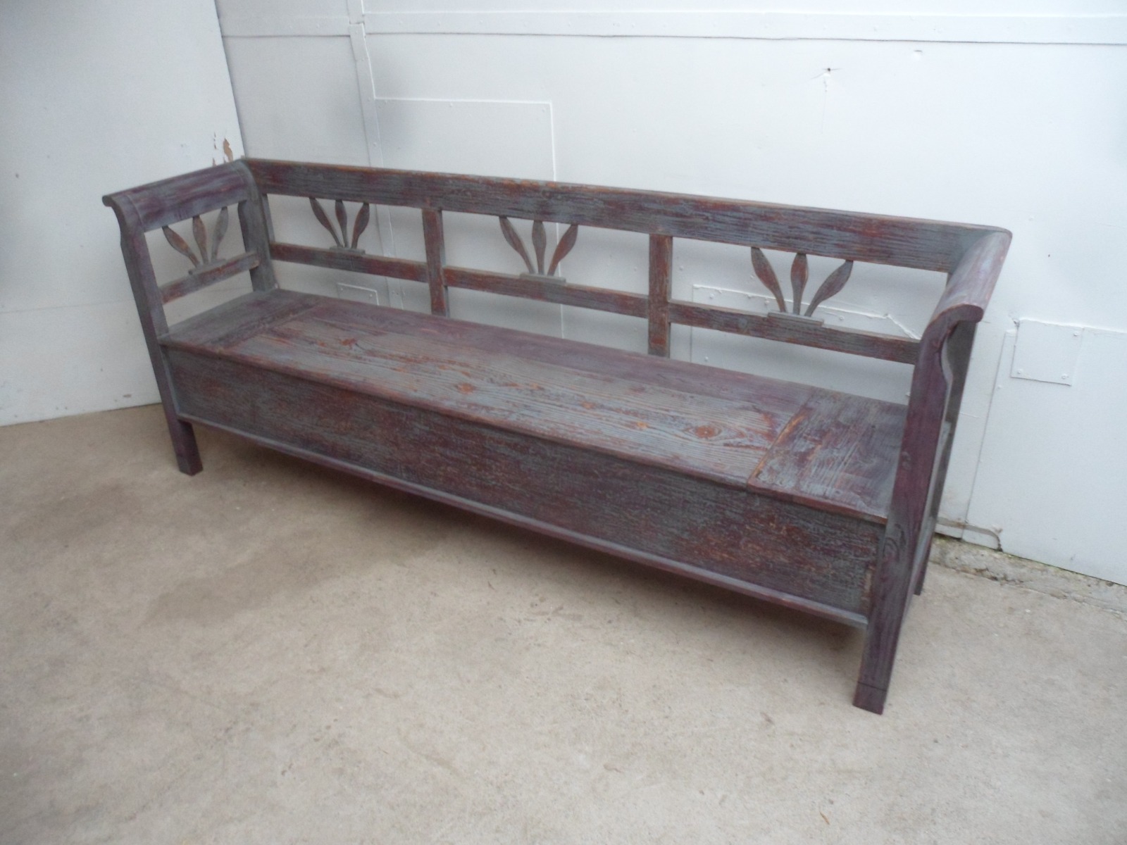 Large Old Pine Painted 4 Seater Grey & Maroon Box Settle / Bench