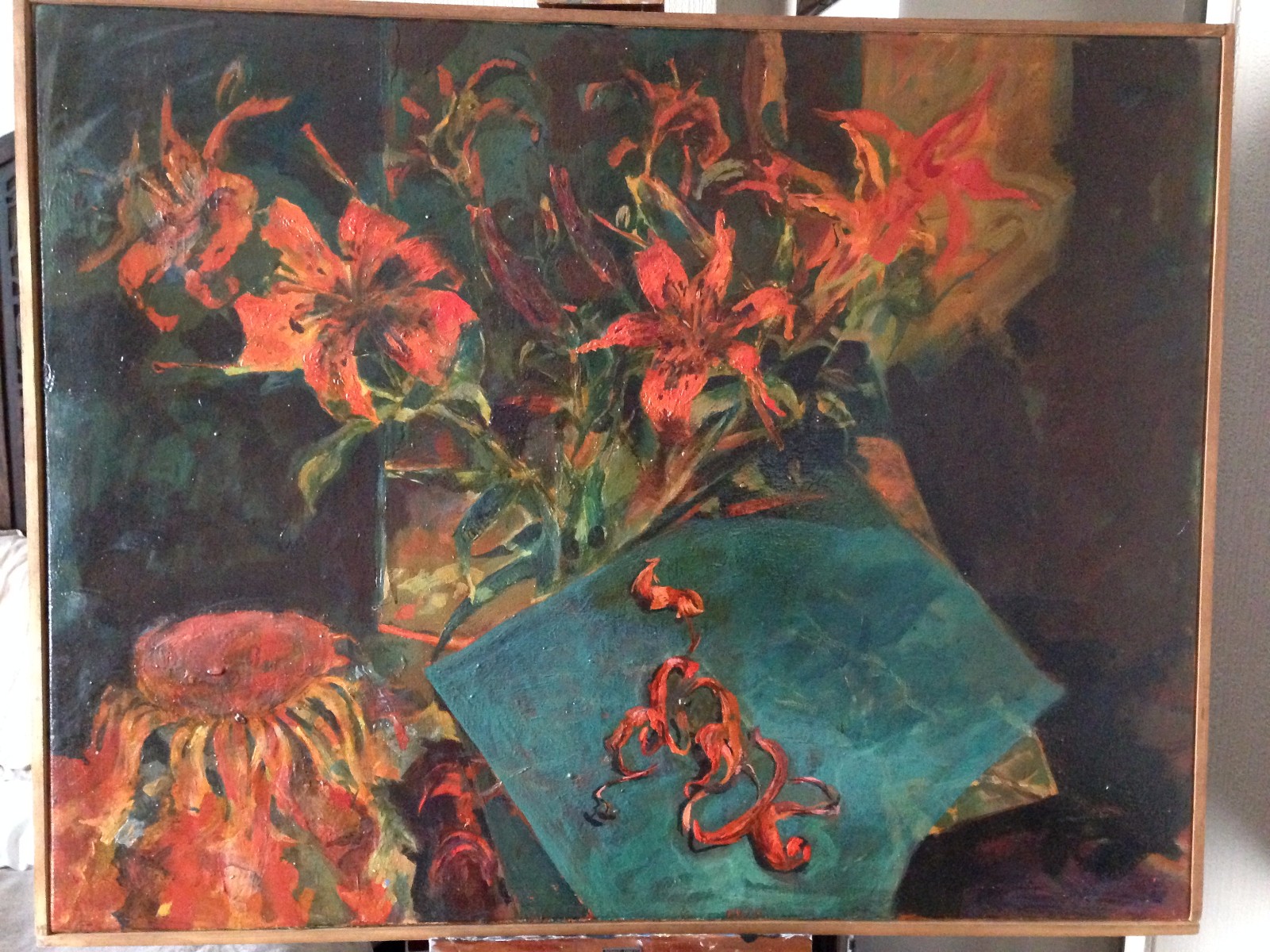Large Original Painting on Canvas Still Life 'Lilies' by noted Judith Tucker (b.1963) done in 1980s.