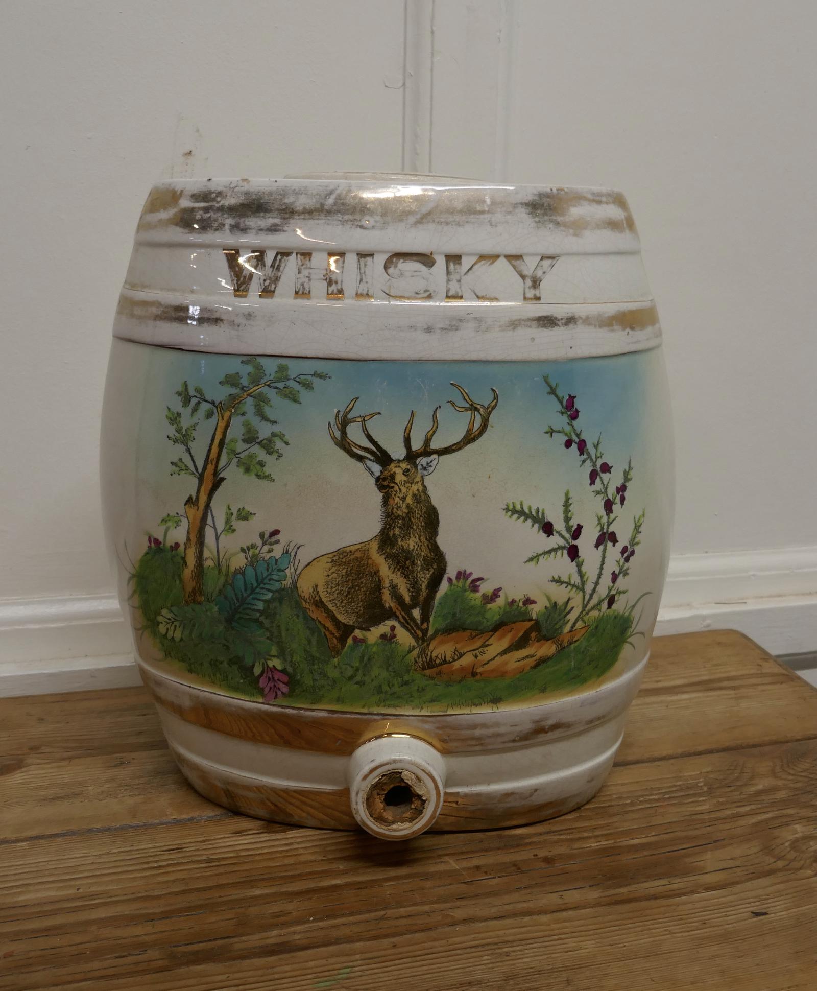 Large Painted Ceramic Scotch Whiskey Barrel, Stag at Bay