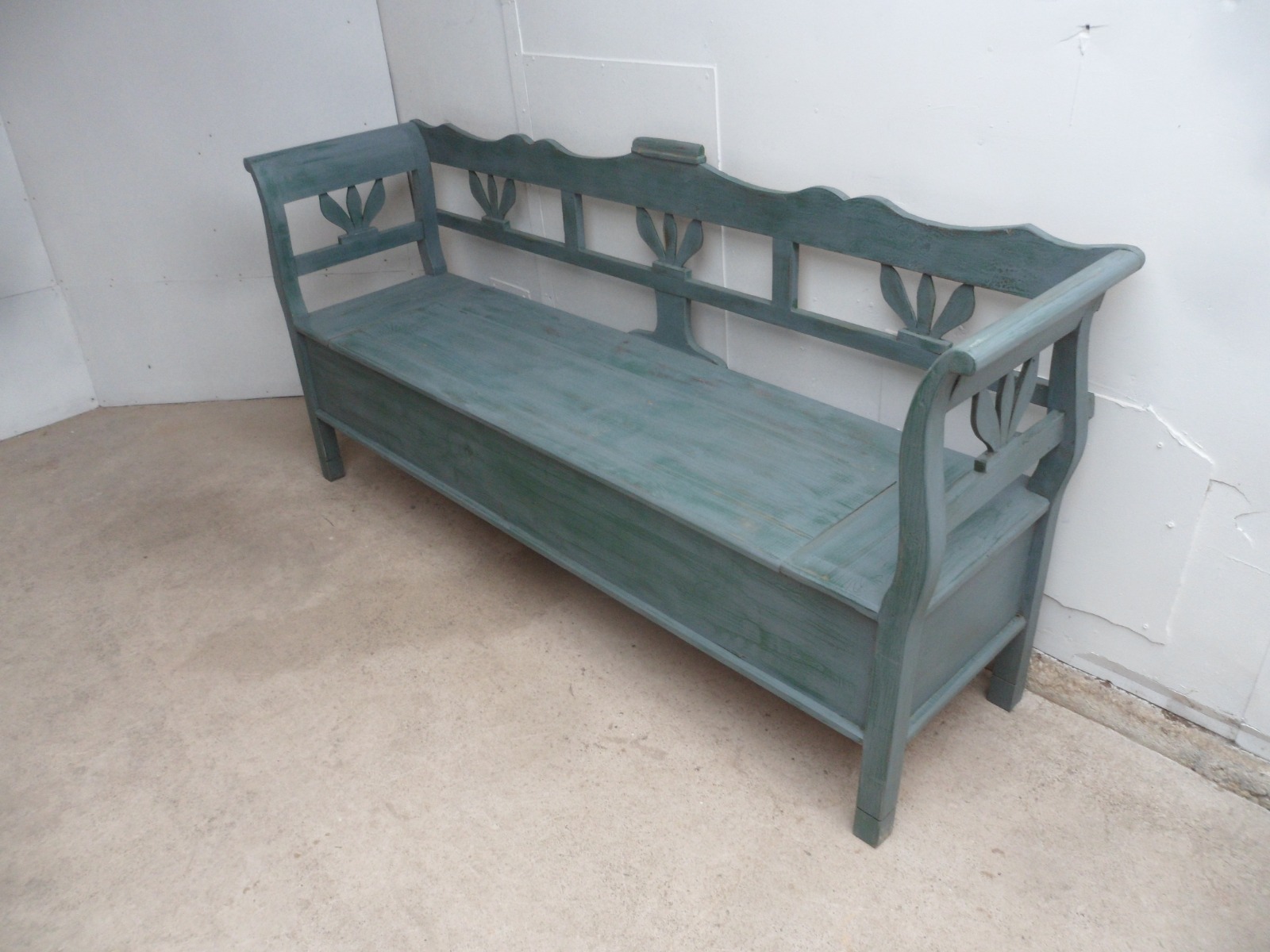 Large Painted Grey & Green Antique Pine Hall / Kitchen Box / Settle / Bench