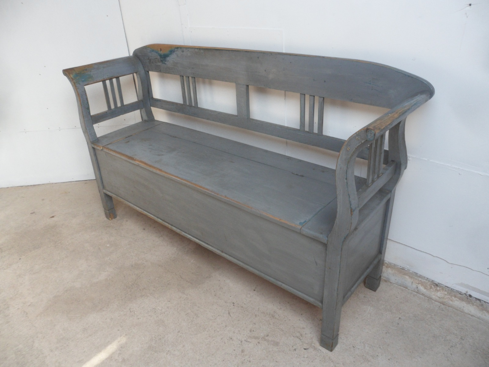 Large Painted Grey Victorian Antique Pine Hall / Kitchen Box / Settle / Bench