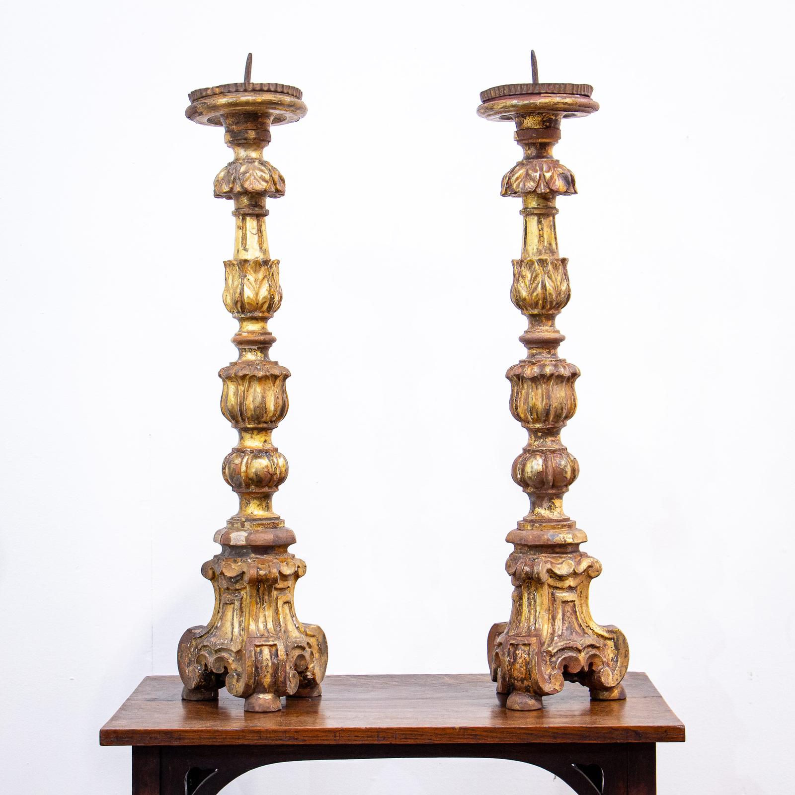 A wonderful pair of French giltwood torcheres, these are decoratively carved and have a good height. They will look great in any room and have practical metal trays to hold a large church candle.
