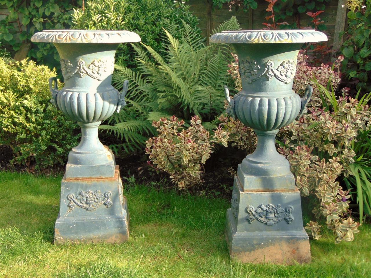 Large Pair of 19th Century Cast Iron Campana Garden Urns on Stands (1 of 1)