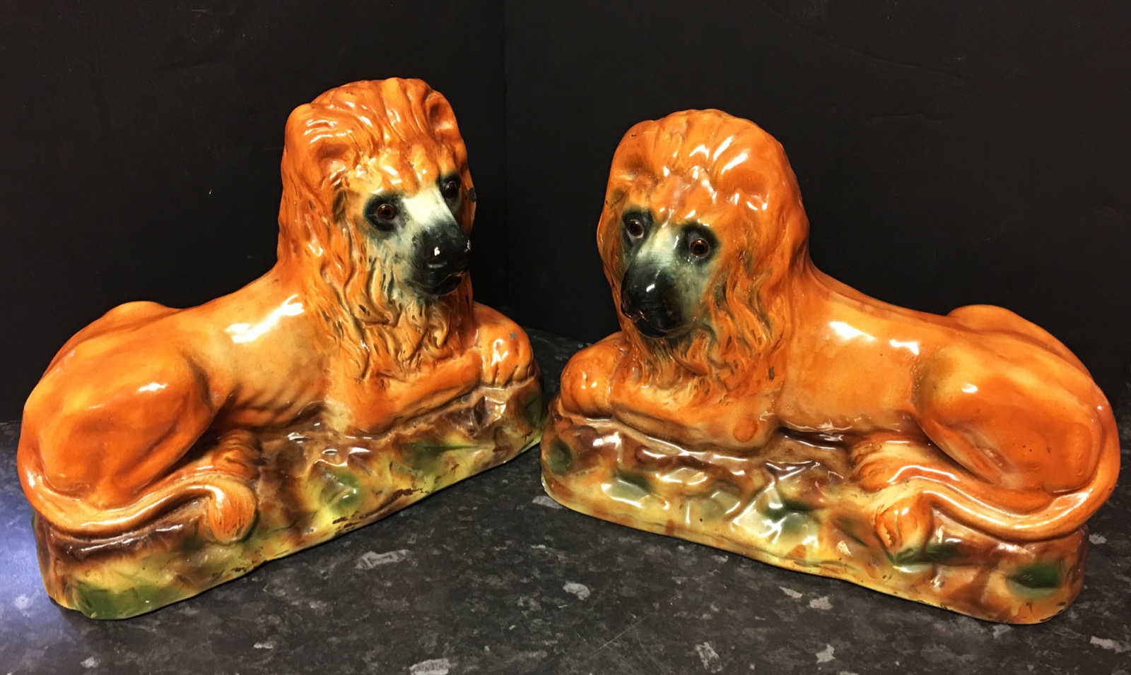 Large Pair of 19th Century Staffordshire Recumbent Lions on Plinths