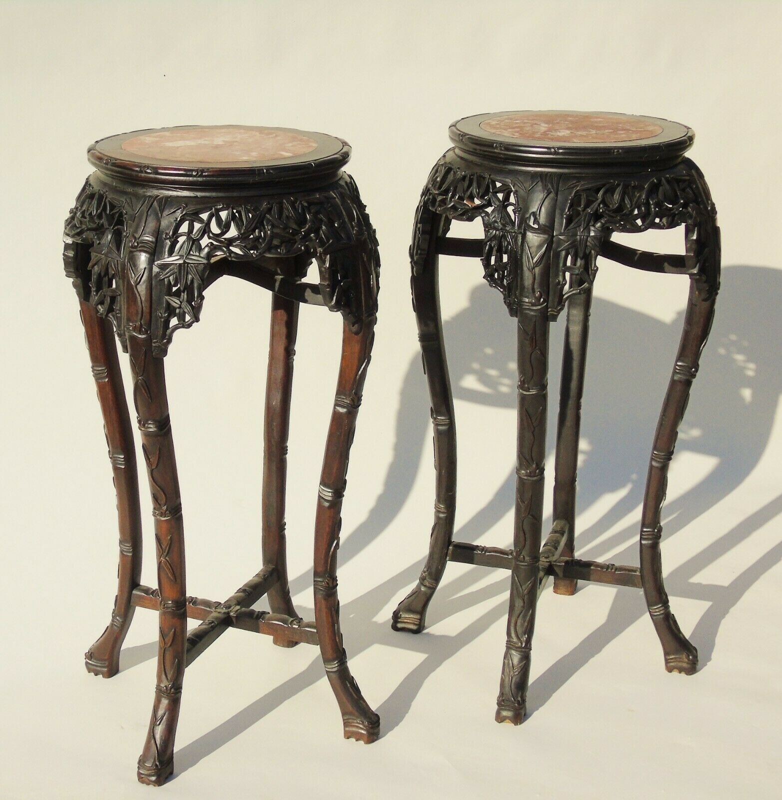 Large Pair of Antique Chinese Hardwood Stands with Rouge Marble
