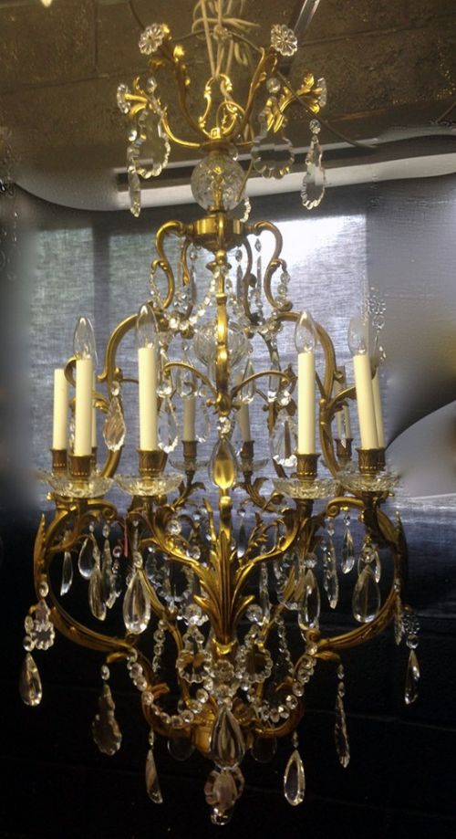 Large Pair of Antique French Brass & Crystal Chandeliers c.1900