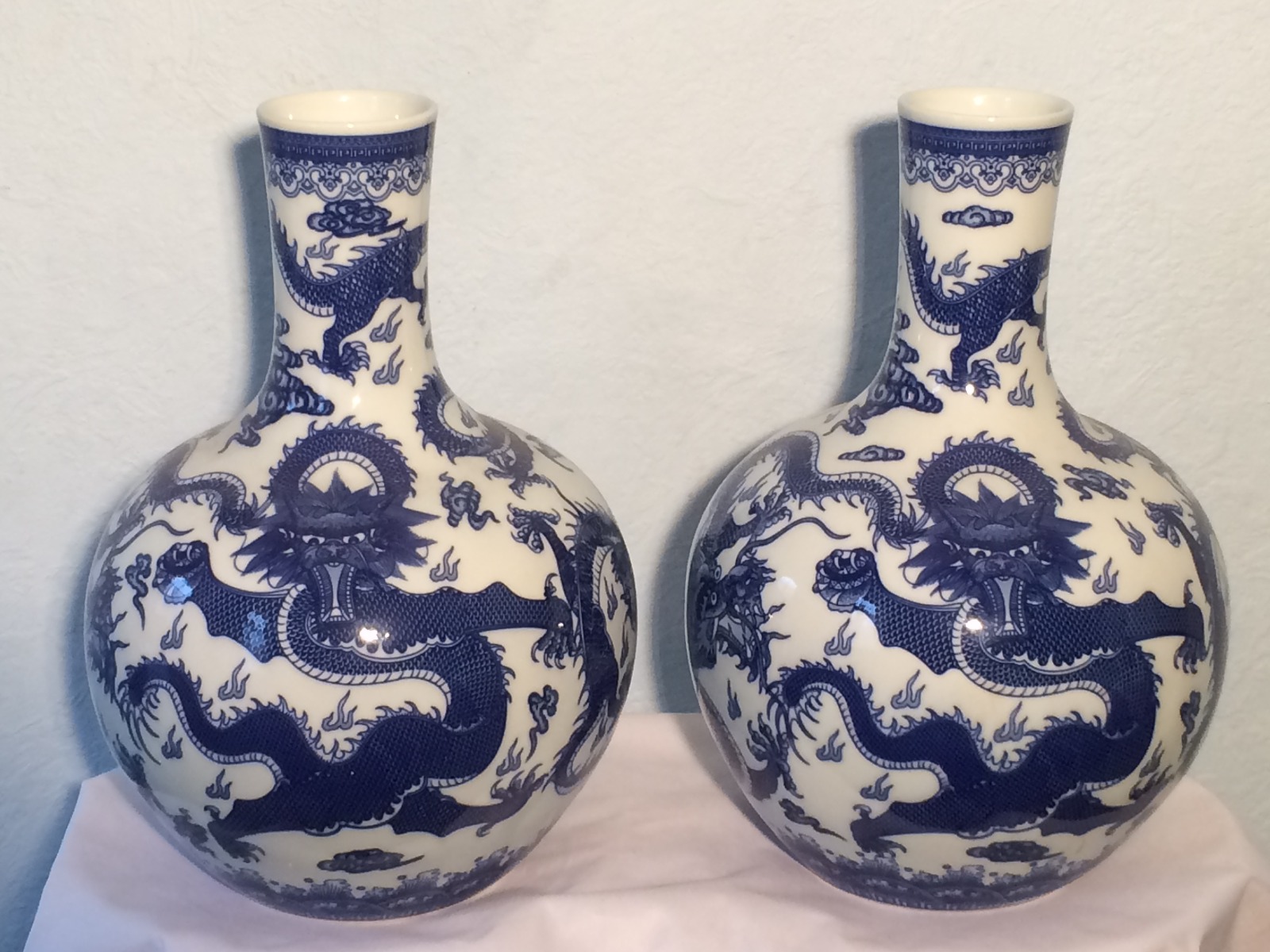 Large Pair of Blue & White Five Dragon Bottle Vases